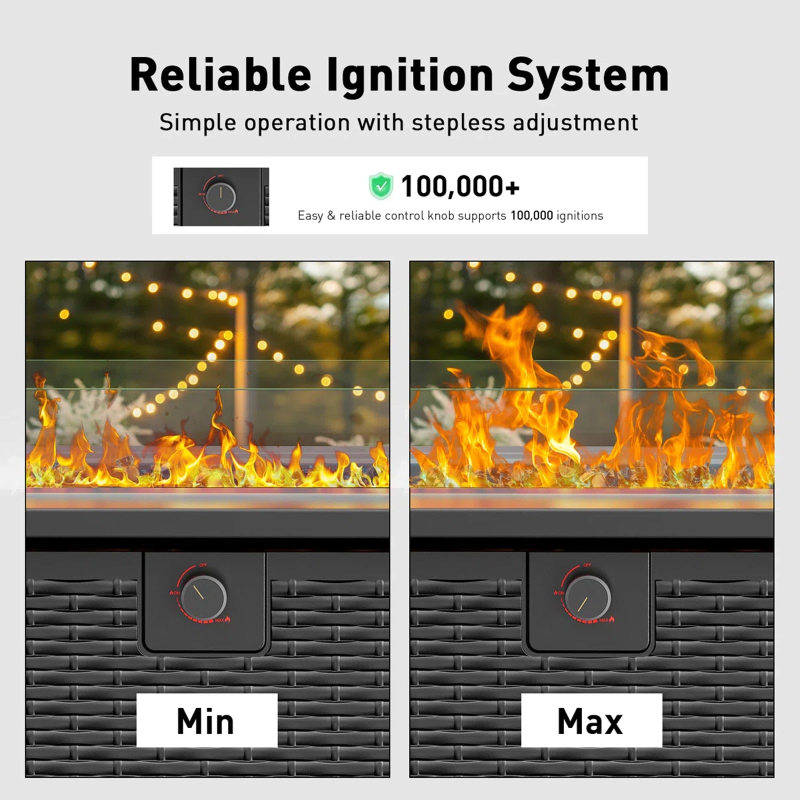 - 【High-efficiency H-burner】Say goodbye to frustrating failed starts! Enjoy instant warmth and ambiance with the high-efficiency H-shaped burner, delivering up to 60,000 BTUs of heat. With an adjustable pulse ignition system, this gas fire pit delivers instant, reliable flames at the turn the switch once—99% success rate guaranteed. Adjust the flame to your ideal warmth, whether for cozy family nights or lively gatherings—no wood, no smoke, just pure ambiance.
