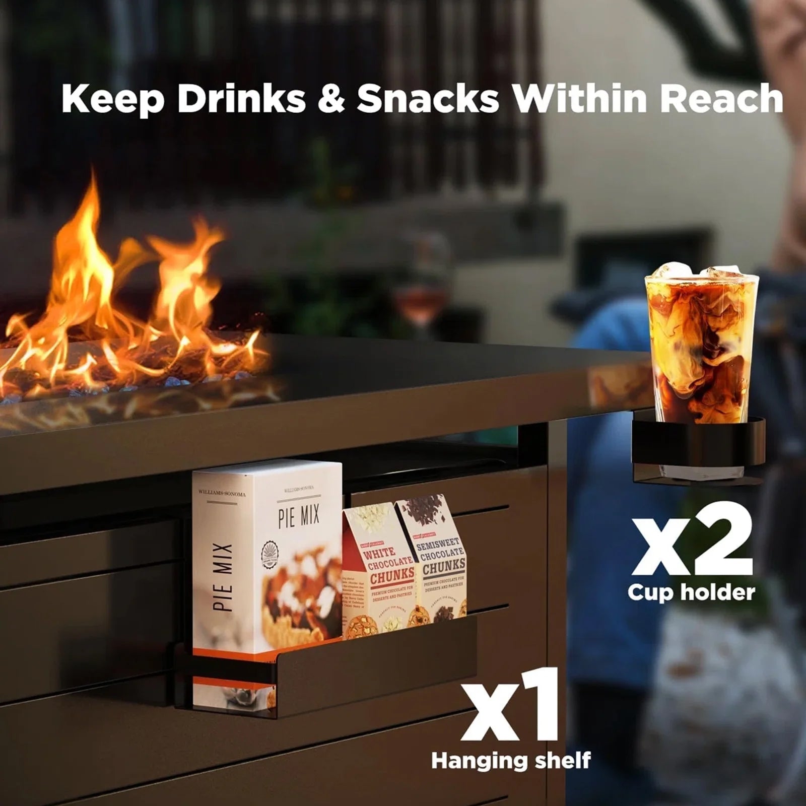 - The gas fire pit comes with 2 cup holders and hanging basket installed under the edge of the tabletop to store drinks, wine, etc. Easy to access without worrying about tipping, but far enough away to avoid high temperatures
