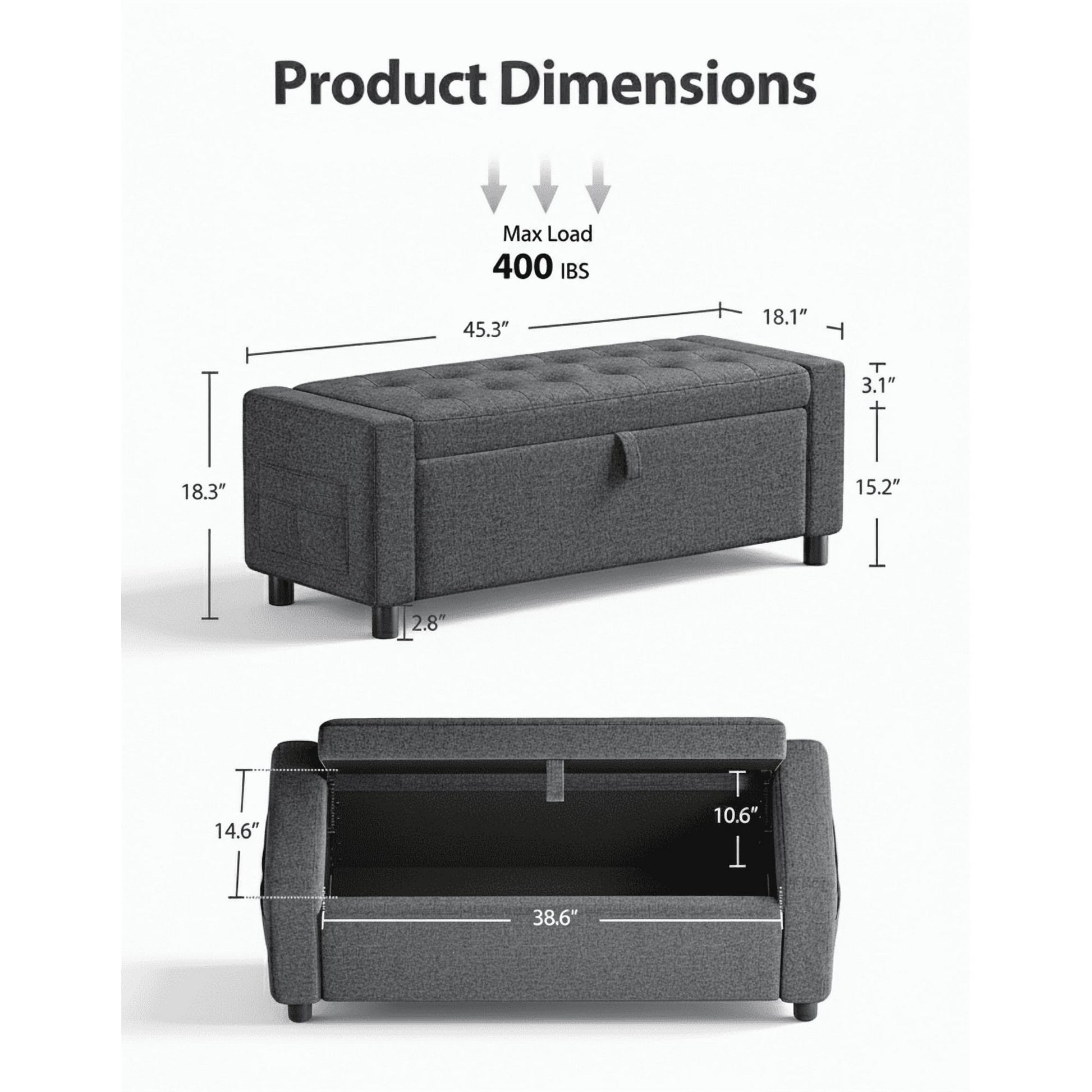 Large Hidden Compartment: 45.3" ottoman bench with a 30 gallon (112 liter) roomy hidden compartment for blankets, pillows, or clutter.The side pocket is perfect for your magazines, remotes or any stuff