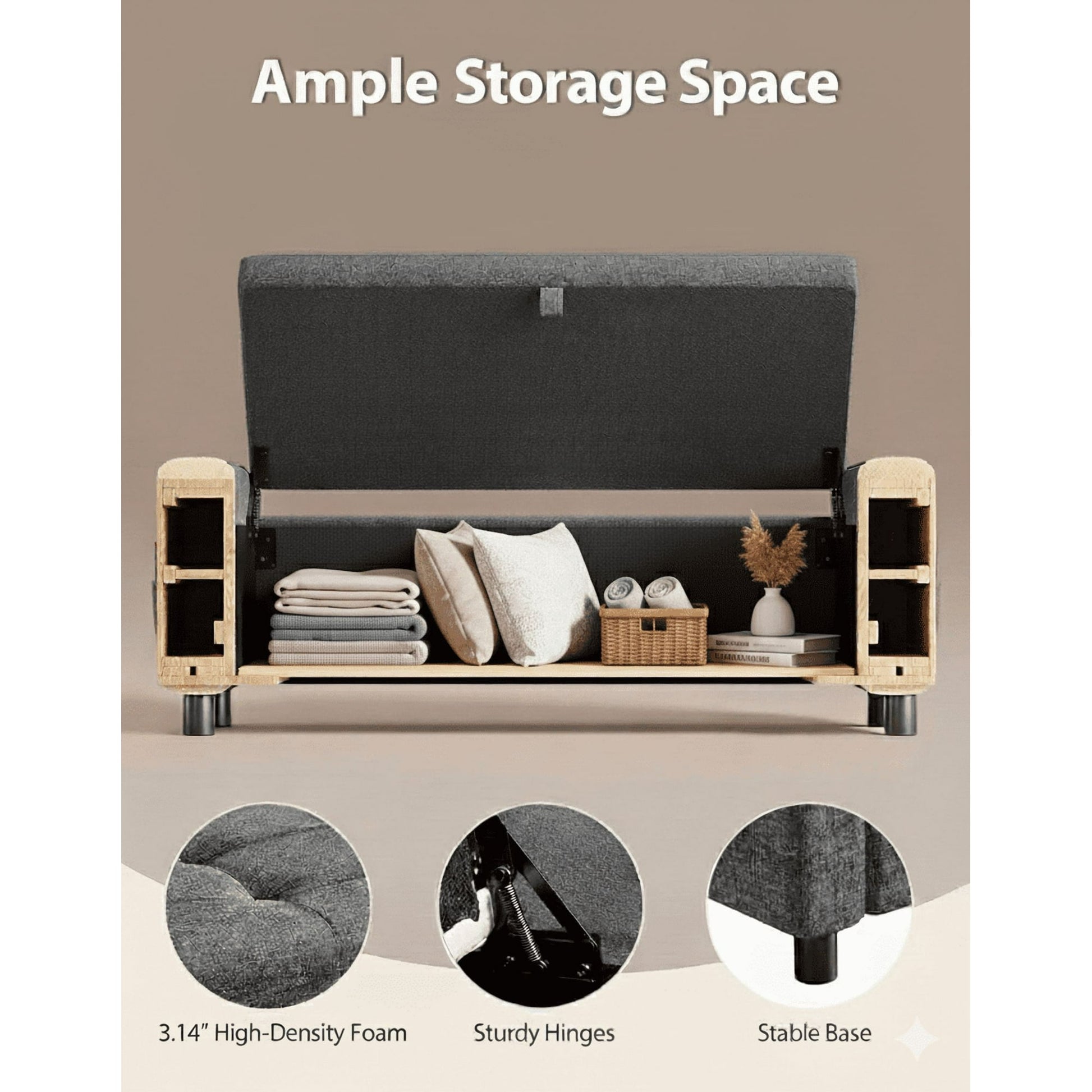 With our CHITOOMA upgrade your bedroom with this 45.3" Storage Ottoman Bench, featuring a spacious hidden compartment to keep your space tidy. The dual-hinge design keeps the lid securely open, so you don’t need to hold it or worry about pinched fingers. Crafted with solid wood frame and sturdy legs, it supports up to 400 lbs and doubles as a stylish footrest or extra seating. Perfect for the end of your bed, this bench combines practicality and elegance in one compact design.