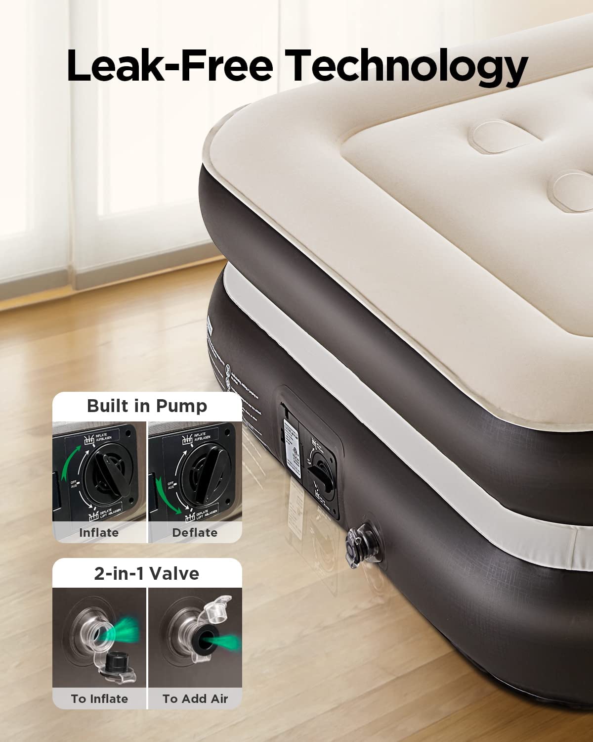 QUICK & EASY INFLATION/DEFLATION -Air mattress with a built-in pump that inflates or deflates in "3-5 minutes" with a turn of a knob. The airbed is also fitted with an extra valve, allowing you to use a handheld electric pump to inflate if you choose. Reminder: Regardless of the inflation method you choose, check that the valve is tightly closed after each inflation.