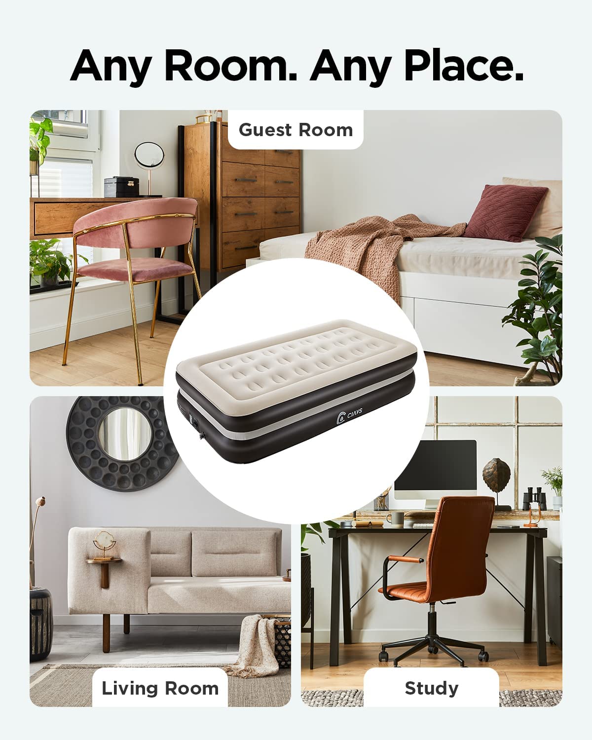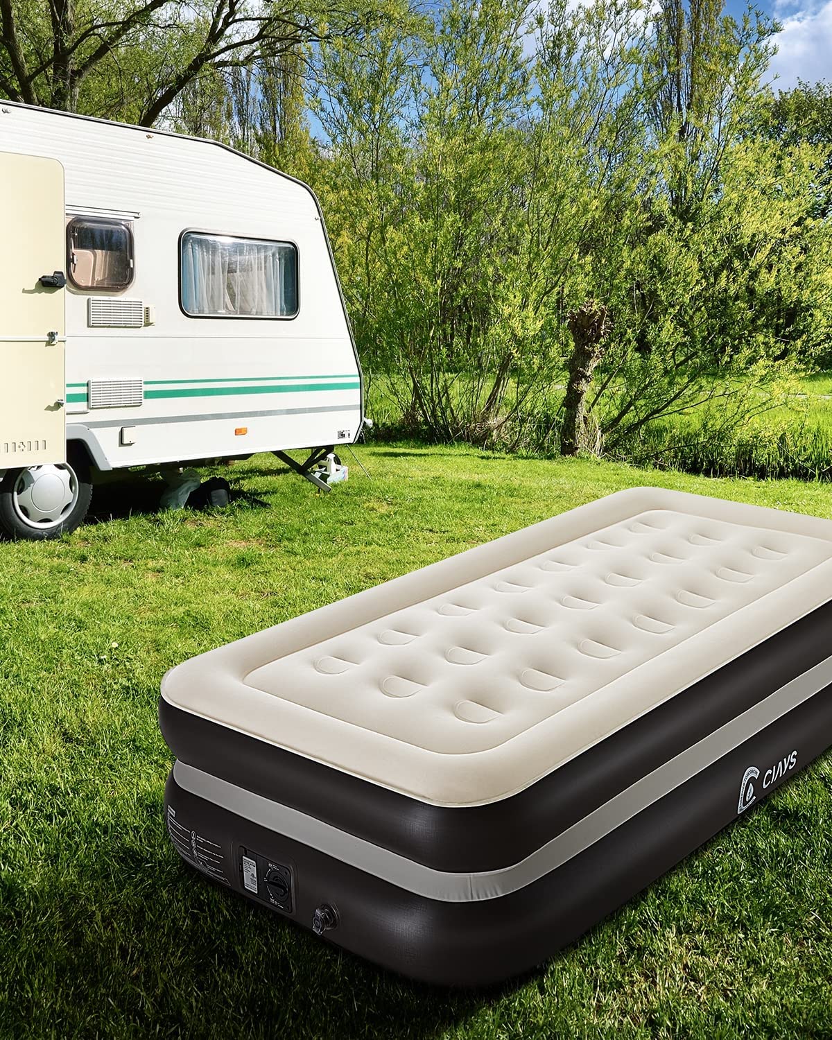 16" DOUBLE LAYERED INFLATABLE BED -Constructed to be used without a bed frame so you can save money for a rainy day! Advanced I-Beam Air Coil structure upholds your air bed flat and firm while supporting up to 330 pounds. Combined with an anti-slip base keeping the inflatable mattress stable and silent.
