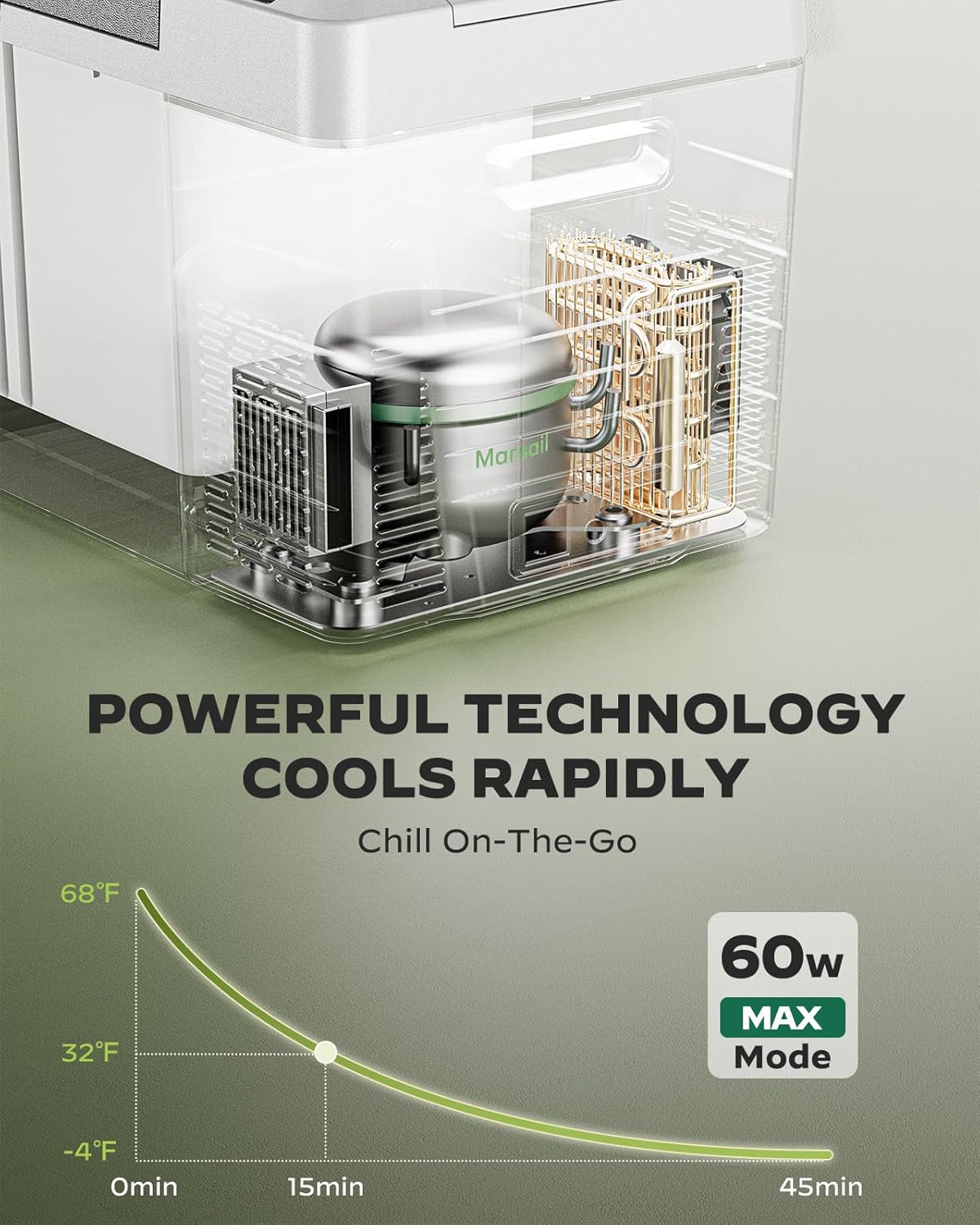 【Advanced Compressor Cooling & Dual Modes】With an advanced compressor, this portable freezer quickly cools from 78°F to 32°F in just 15 minutes in MAX mode (60W). Switch to MIN mode (45W) for efficient, energy-saving operation during long journeys. Dual cooling modes ensure precise temperature control while preventing car battery drain.