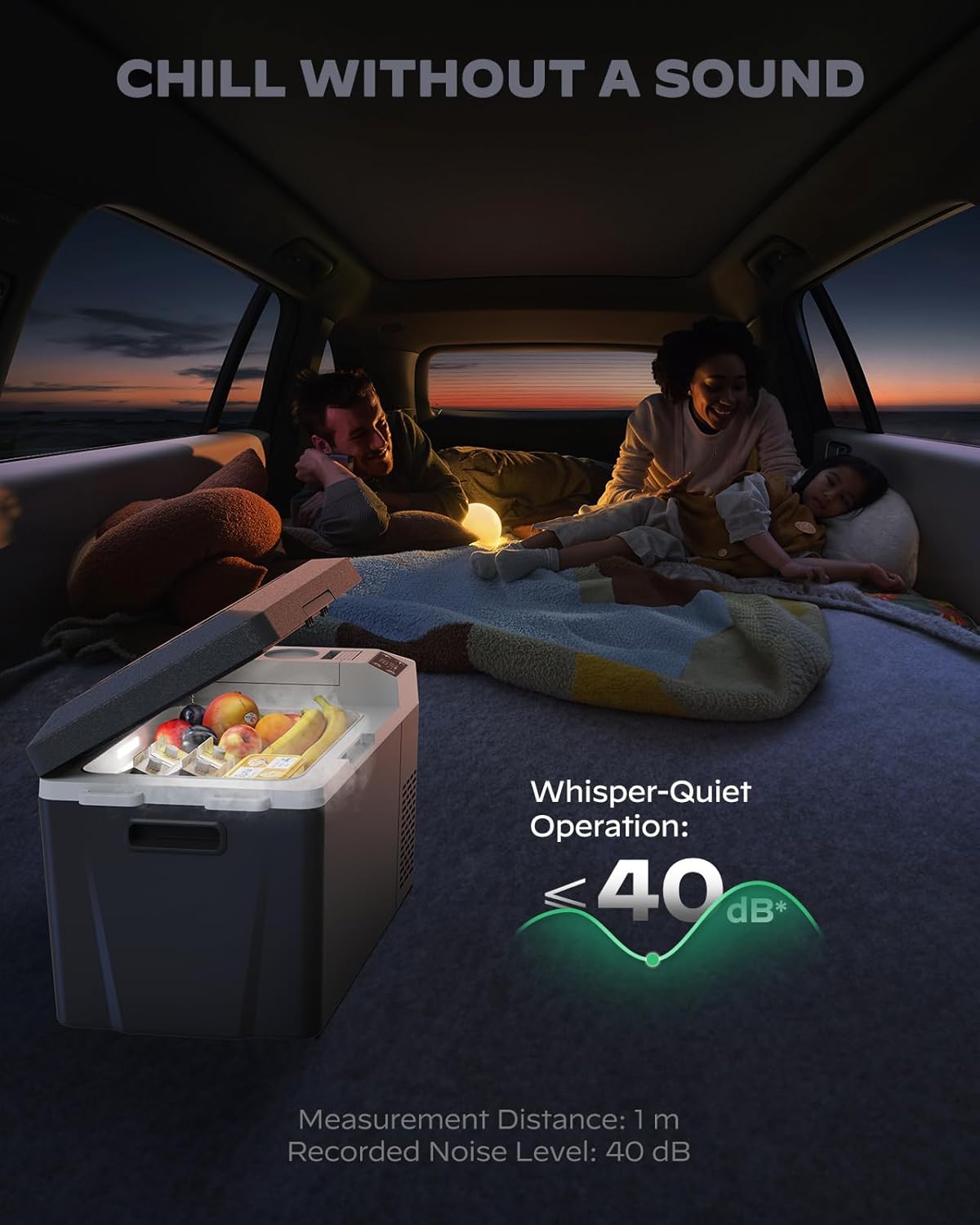 【Ultra-Quiet Design】The car refrigerator runs quietly at just 45 decibels, providing a calm and comfortable experience during use. Designed for stability, this 12V fridge remains stable and reliable even when driving on uneven or rough roads.