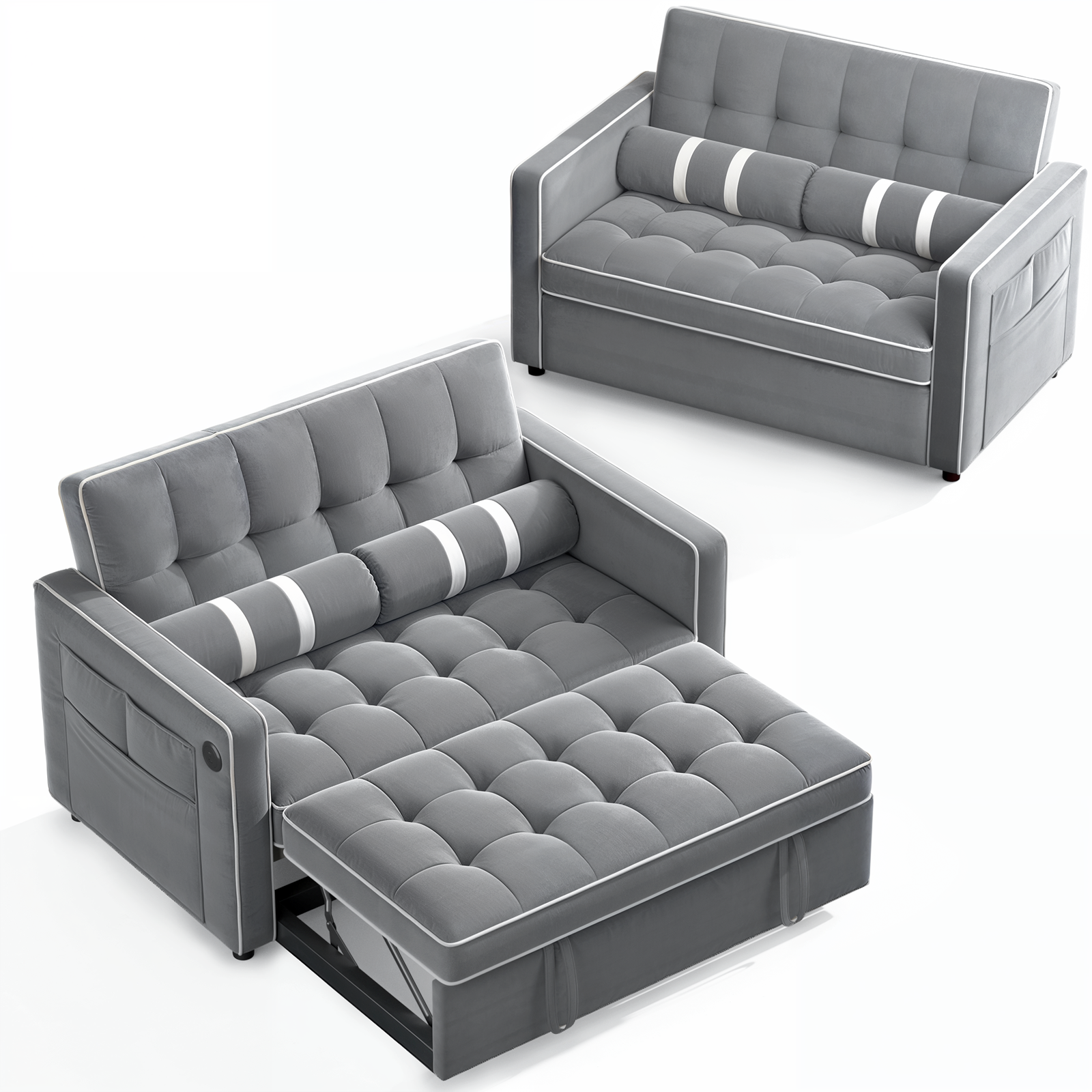 Upgrade your home with this luxurious velvet futon sofa bed, designed for both style and comfort. Featuring elegant white bindings and a sophisticated square tufted pattern, this convertible loveseat seamlessly blends with any décor. The high-density foam filling provides exceptional support, ensuring a comfortable seating experience without sinking. Effortlessly adjust between three reclining angles (105° to 180°) for personalized comfort—perfect for lounging, reading, or napping. The built-in multi-pocket storage keeps essentials like TV remotes, smartphones, magazines, keys, and glasses within easy reach. Easily transform this stylish loveseat into a pull-out sleeper sofa using the dual auxiliary hand straps for a smooth conversion. Dimensions: Sofa: 52.36"W x 32.68"D x 33.07"H Sleep Sofa: 70.27"D x 44.28"W x 17"H Enjoy enhanced neck and head support with two included soft rectangular pillows, which can also be used for added comfort under your knees, back, or ankles. Built with a sturdy frame, this futon supports up to 600 lbs, ensuring durability and reliability.