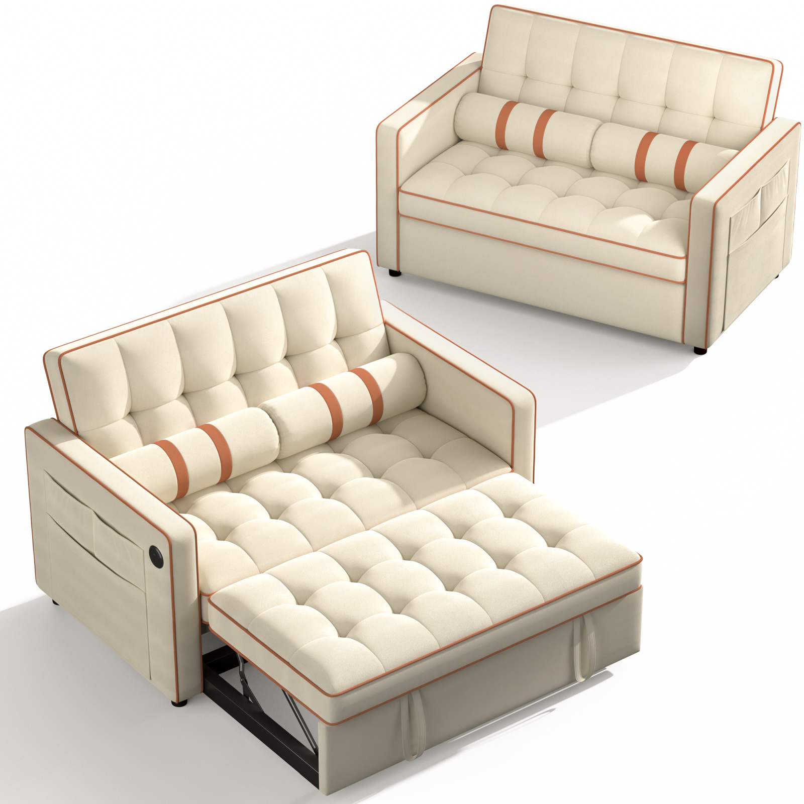 Upgrade your home with this luxurious velvet futon sofa bed, designed for both style and comfort. Featuring elegant white bindings and a sophisticated square tufted pattern, this convertible loveseat seamlessly blends with any décor. The high-density foam filling provides exceptional support, ensuring a comfortable seating experience without sinking. Effortlessly adjust between three reclining angles (105° to 180°) for personalized comfort—perfect for lounging, reading, or napping. The built-in multi-pocket storage keeps essentials like TV remotes, smartphones, magazines, keys, and glasses within easy reach. Easily transform this stylish loveseat into a pull-out sleeper sofa using the dual auxiliary hand straps for a smooth conversion. Dimensions: Sofa: 52.36"W x 32.68"D x 33.07"H Sleep Sofa: 70.27"D x 44.28"W x 17"H Enjoy enhanced neck and head support with two included soft rectangular pillows, which can also be used for added comfort under your knees, back, or ankles. Built with a sturdy frame, this futon supports up to 600 lbs, ensuring durability and reliability.