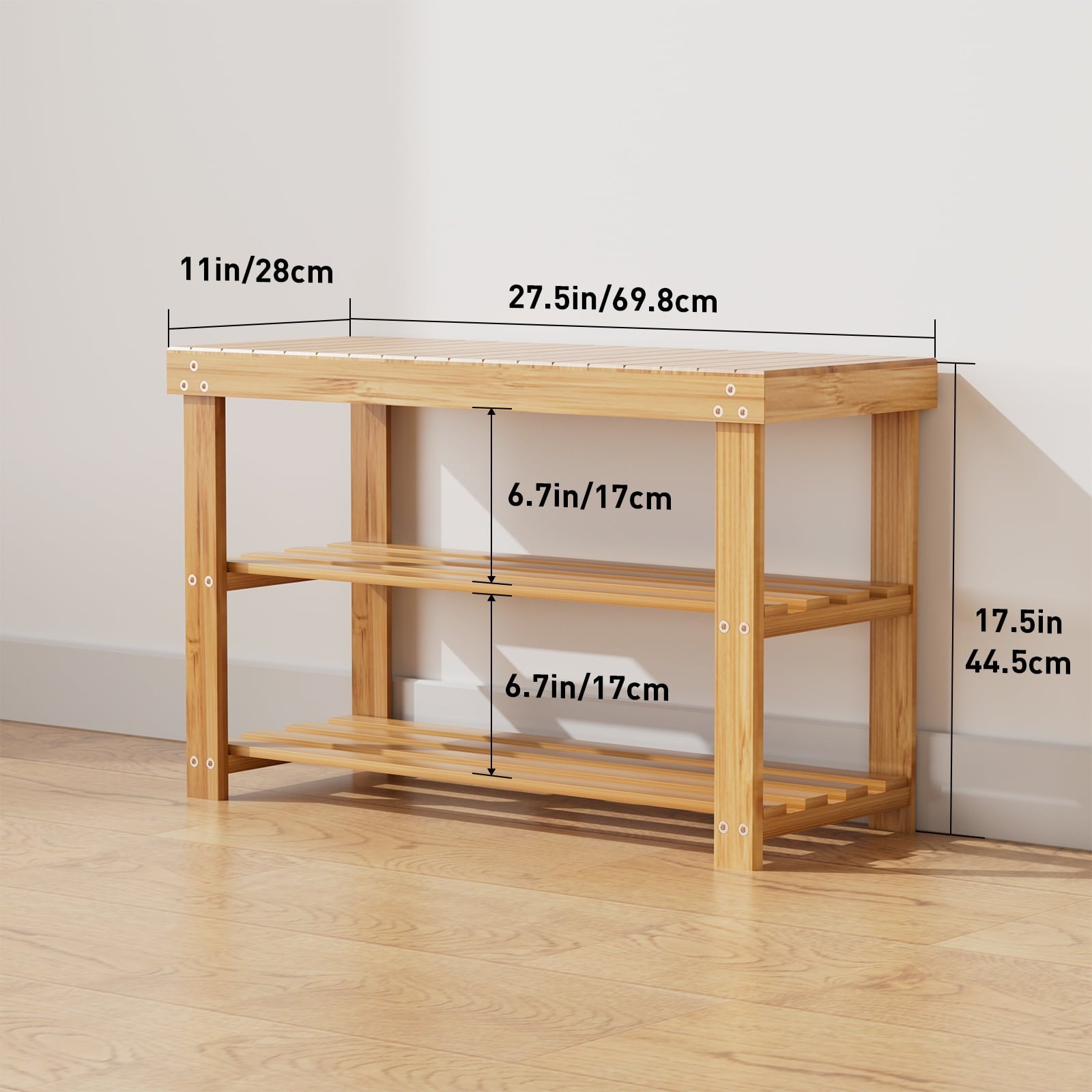 - Space-Saving Shoe Bench. Our CHITOOMA bamboo shoe rack and bench combination saves space with dimensions of 27.5" in length, 11" in width, and 17.5" in height, making it perfect for neatly organizing shoes or bags in the entryway.