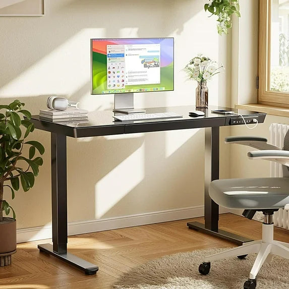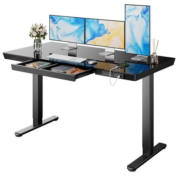 CHITOOMA 55" x 28" One Piece Black Glass Top Standing Desk with Drawer, Electric Height Adjustable Office Desk with USB Charging Ports, Sit to Stand Desk for Home