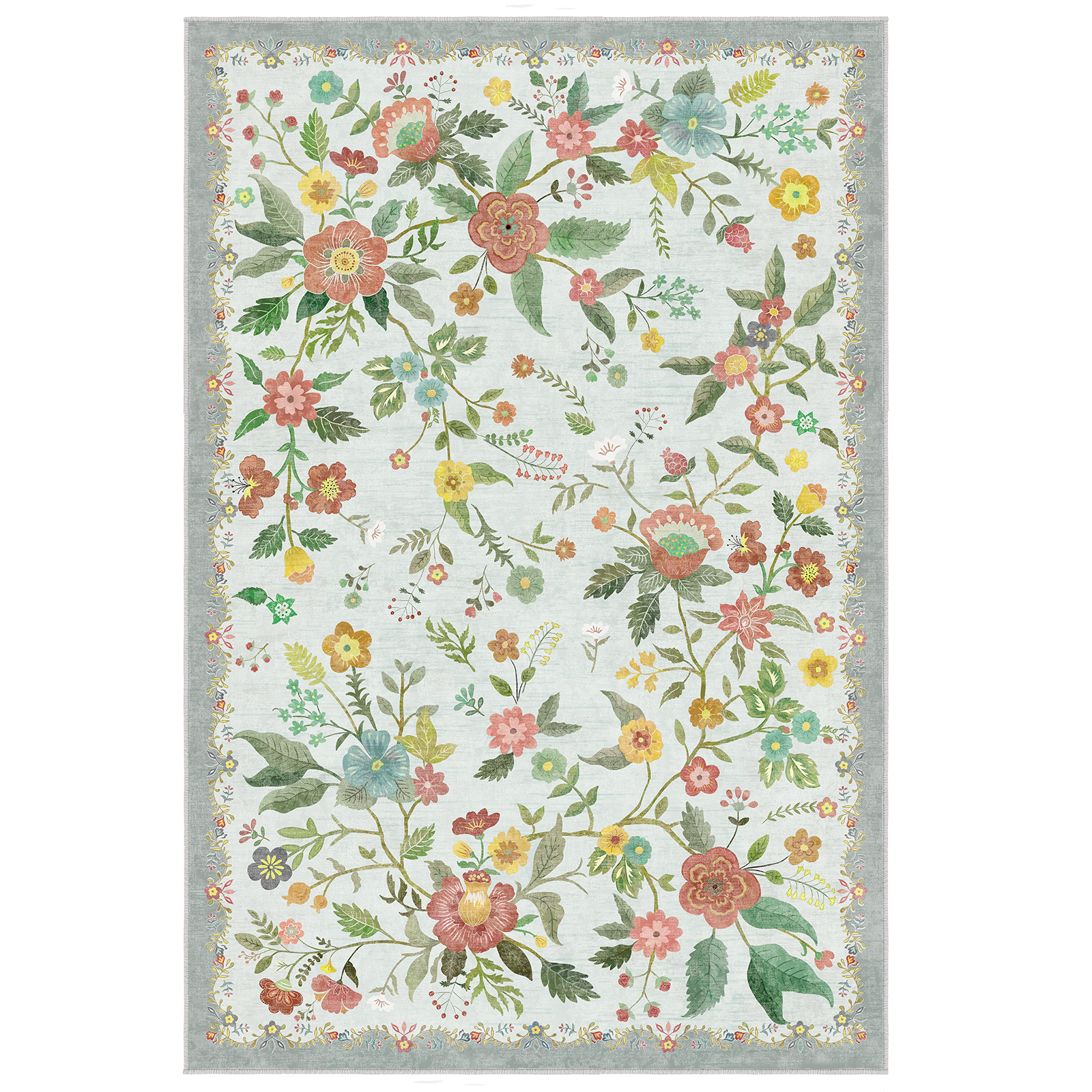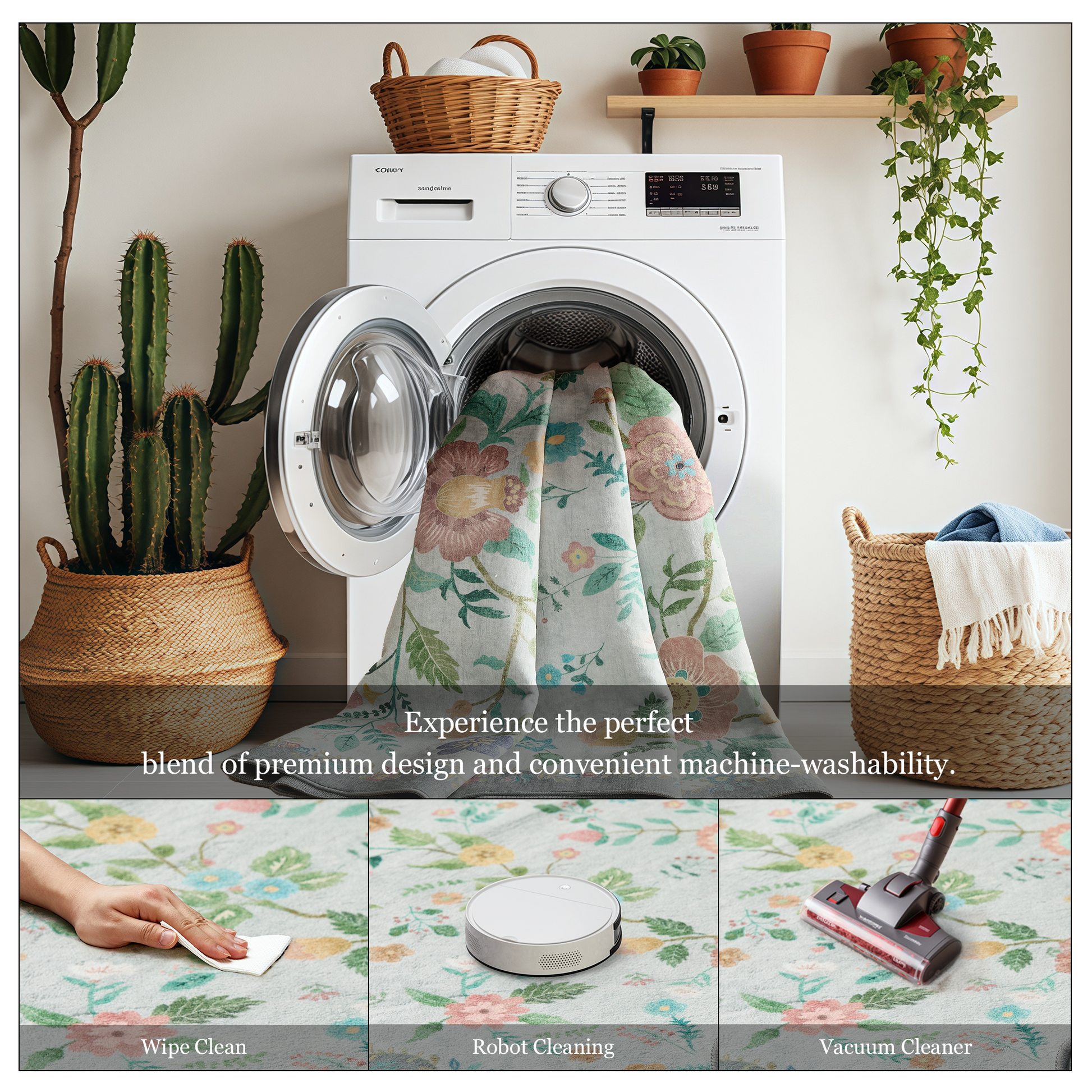 Easy Care】With its machine-washable feature, this floral area rug is incredibly easy to clean and maintain. Simply toss it in the washer, and it’ll look as good as new—every time. For daily care, a swift sweep or wipe suffices. Perfect for busy households, pet owners, or anyone who values convenience.