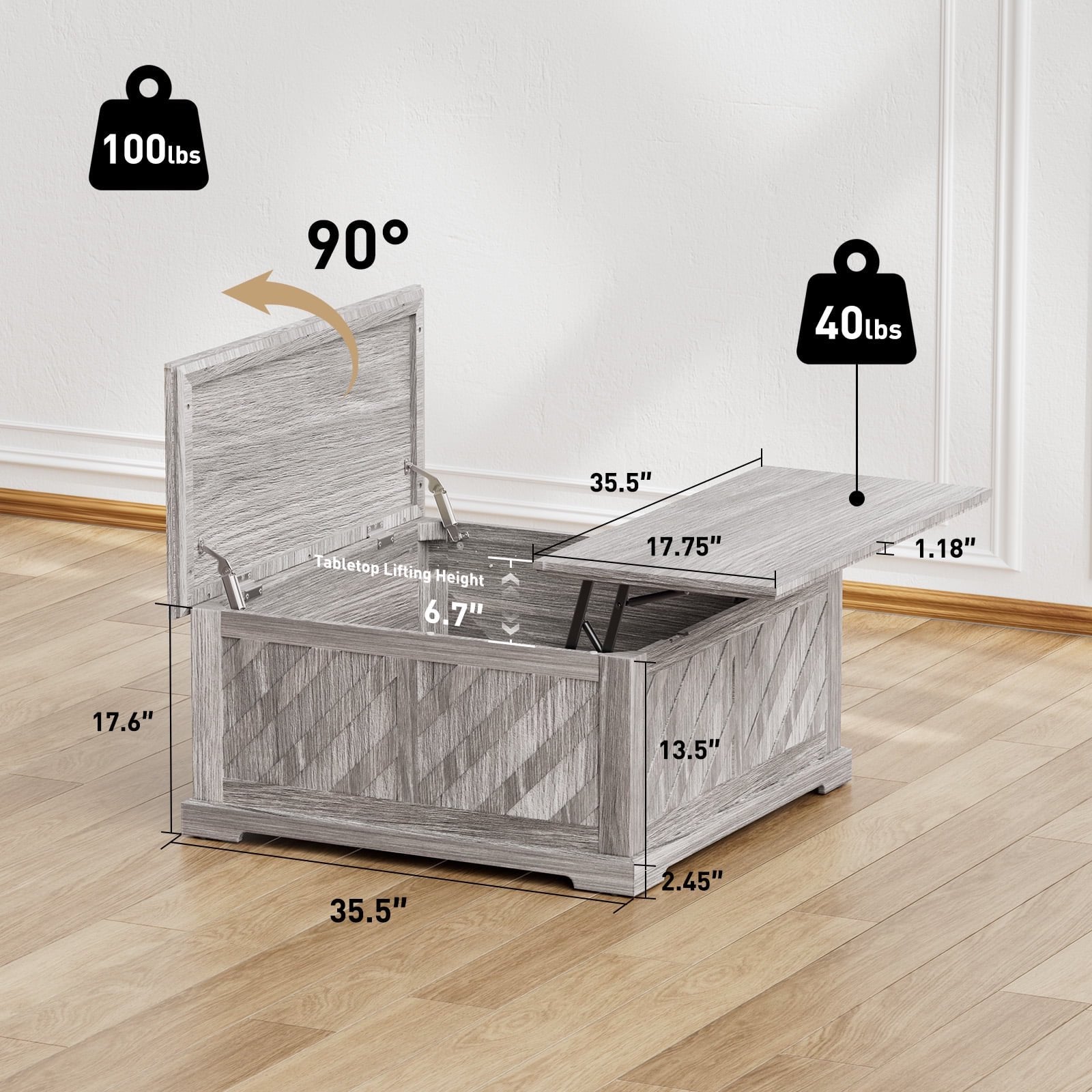 Furthermore, this coffee table featuring a refined wood grain tabletop and Z-shaped wooden accents on the sides, it is enhanced with riveted metal corner brackets for a touch of vintage charm and added durability. The unique clamshell lift-top design allows for 90° free opening, supported by gas struts for smooth, cushioned movement, ensuring safety and preventing sudden drops. With a 35.5" x 35.5" spacious tabletop, it offers ample room for daily activities, while the 150L hidden storage compartment provides plenty of space for blankets, books, remote controls, gaming consoles, and more, keeping your living room organized. Crafted from high-density thickened wood, this sturdy structure supports up to 200 lbs, ensuring long-lasting durability.