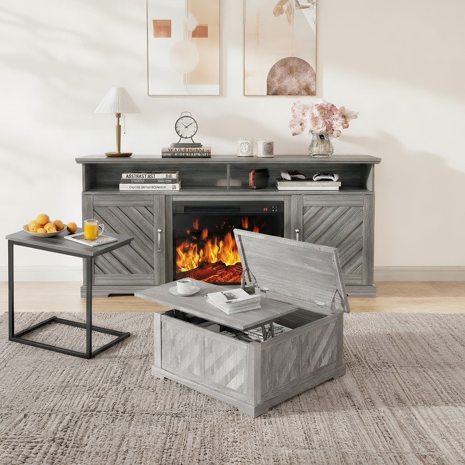 CHITOOMA 75" Fireplace TV Stand, Coffee Table and C Shaped End Table Combo, Farmhouse Entertainment Center with 23" Electric Fireplace for Living Room, Bedroom, Gray