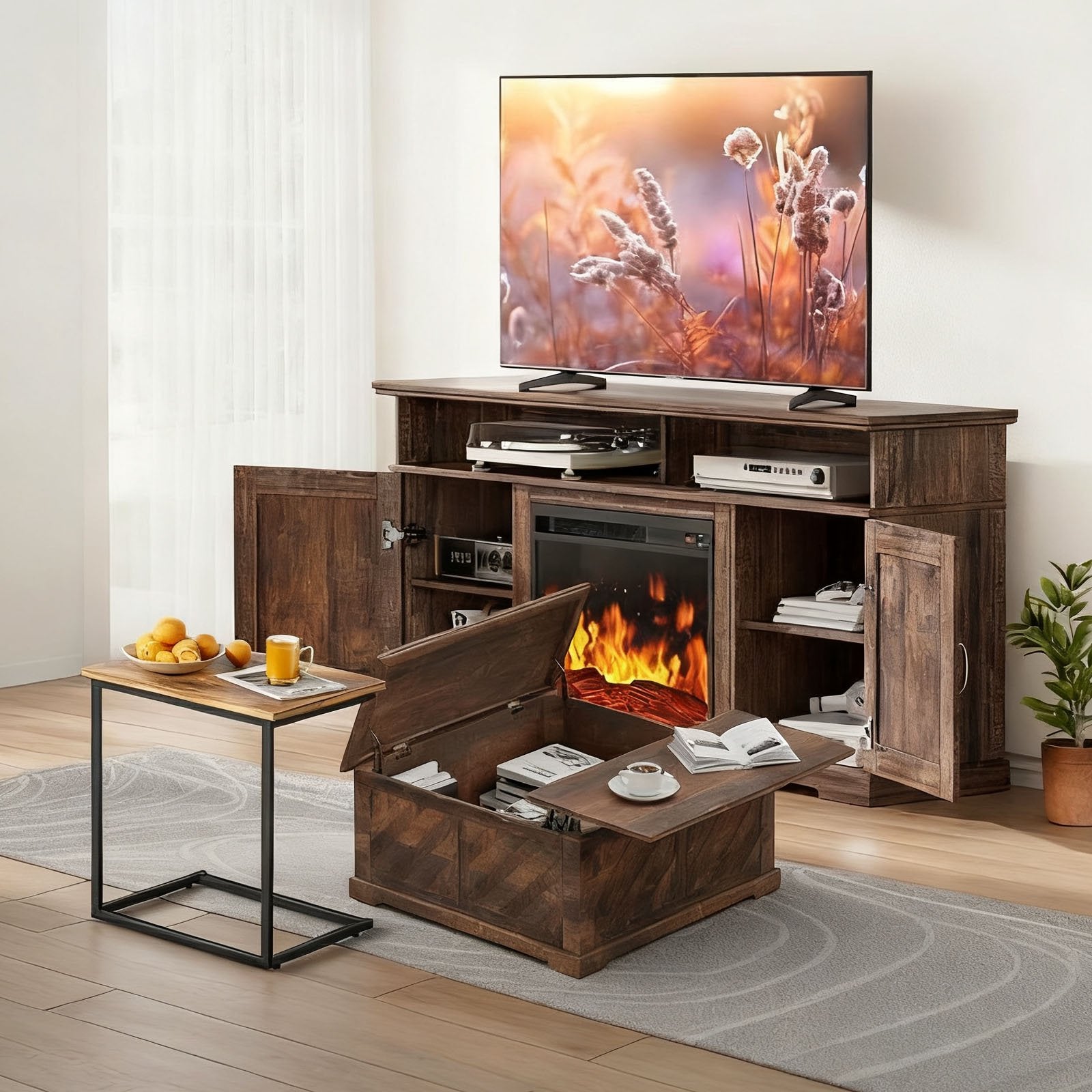 ❤️Our CHITOOMA fireplace TV stand, coffee table, c shaped end table set, is great choice for you! One price, three products!❤️