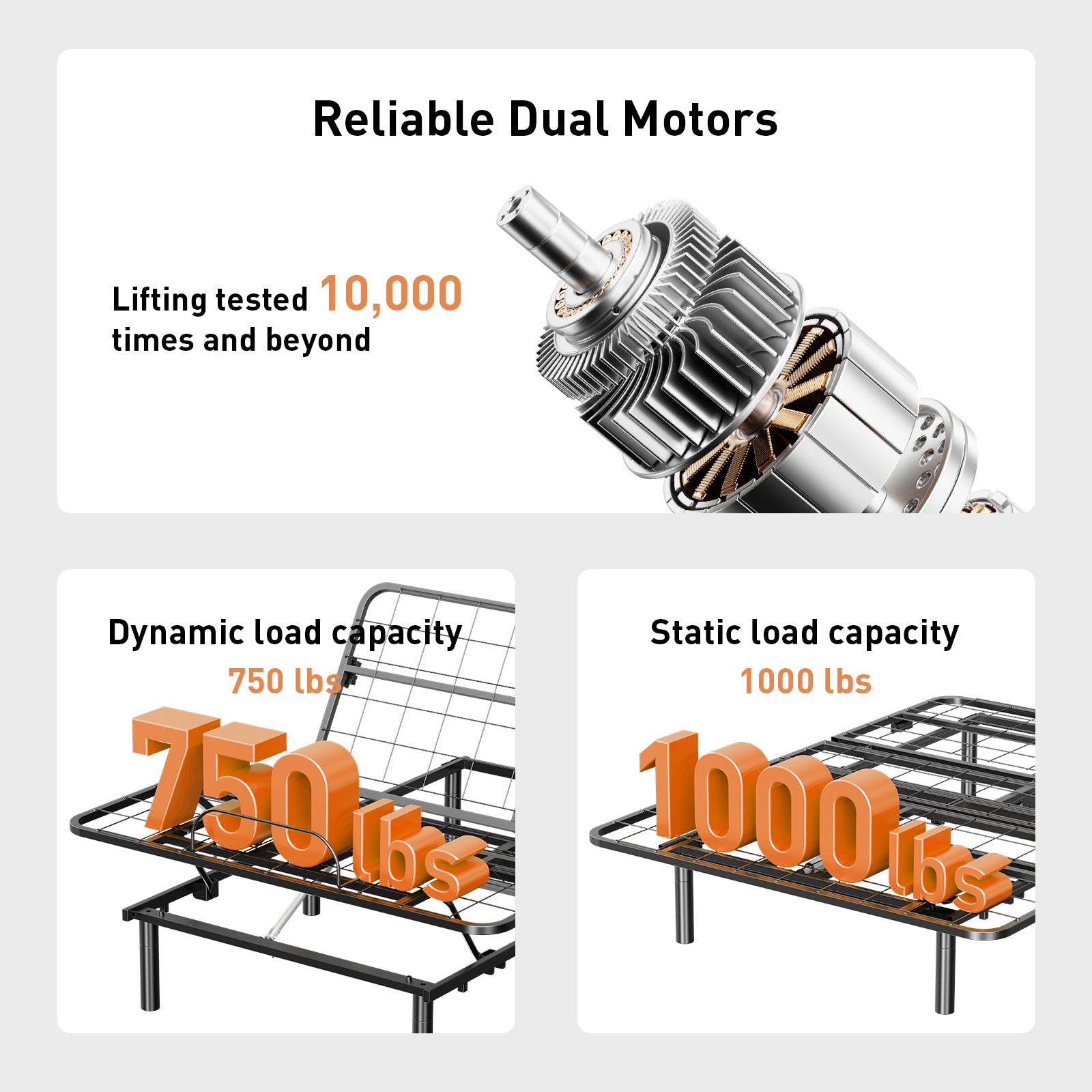 - Quiet Motor & Sturdy Structure: The DewertOkin GmbH dual-motor system provides quiet operation while adjusting the bed frame. Built with a robust iron frame, it has passed over 15,000 lifting tests, exceeding industry standards.