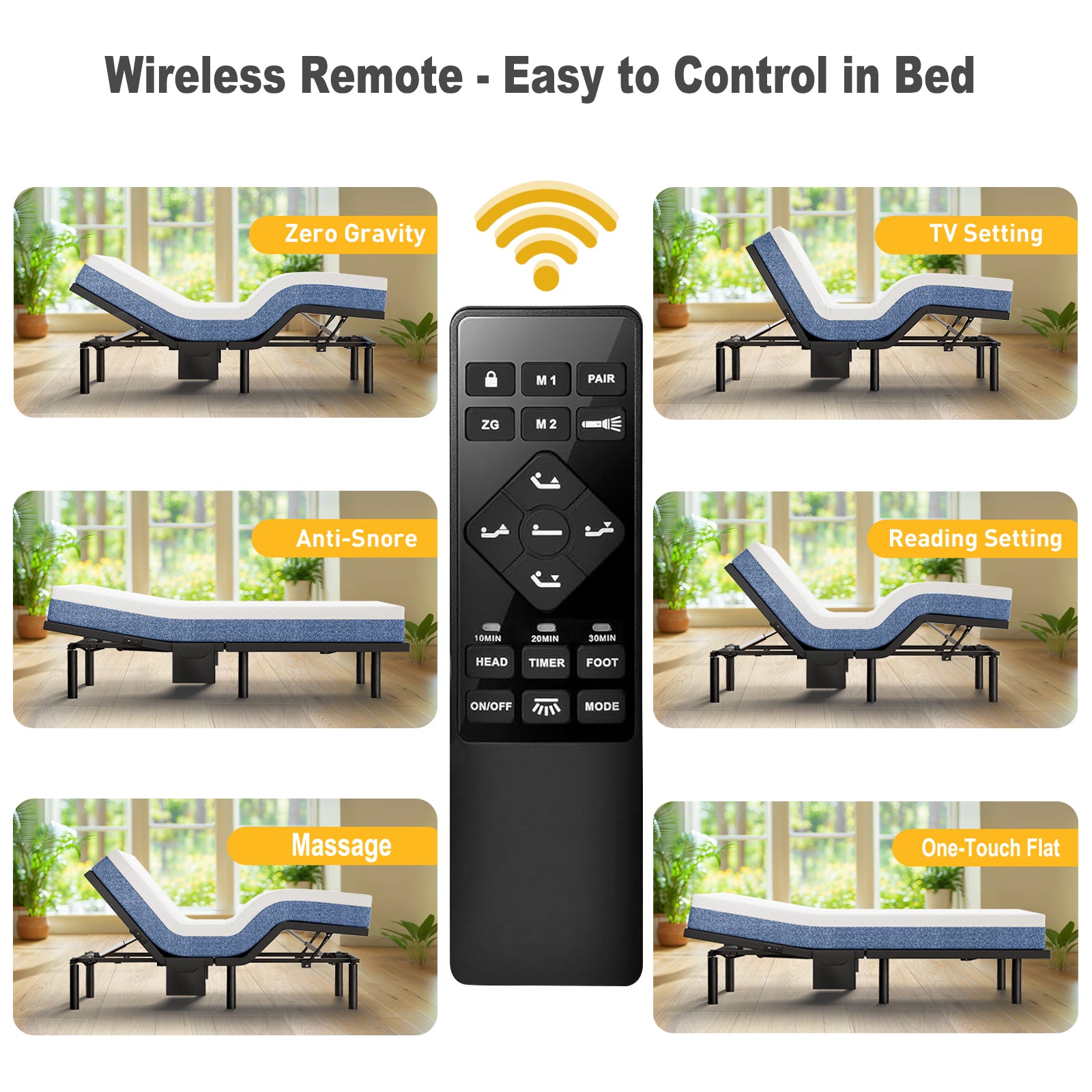 - With Massage — Customizable Massage Settings:Enjoy the soothing wave and intense pulse massage feature to help relieve tension and discomfort. Equipped with 4 massage modes and 3 intensity levels, this electric adjustable bed frame offers targeted upper body and leg massage to help alleviate muscle tension, reduce stress, and improve circulation—all easily managed through the included wireless remote control. It is perfect for unwinding after a long day.