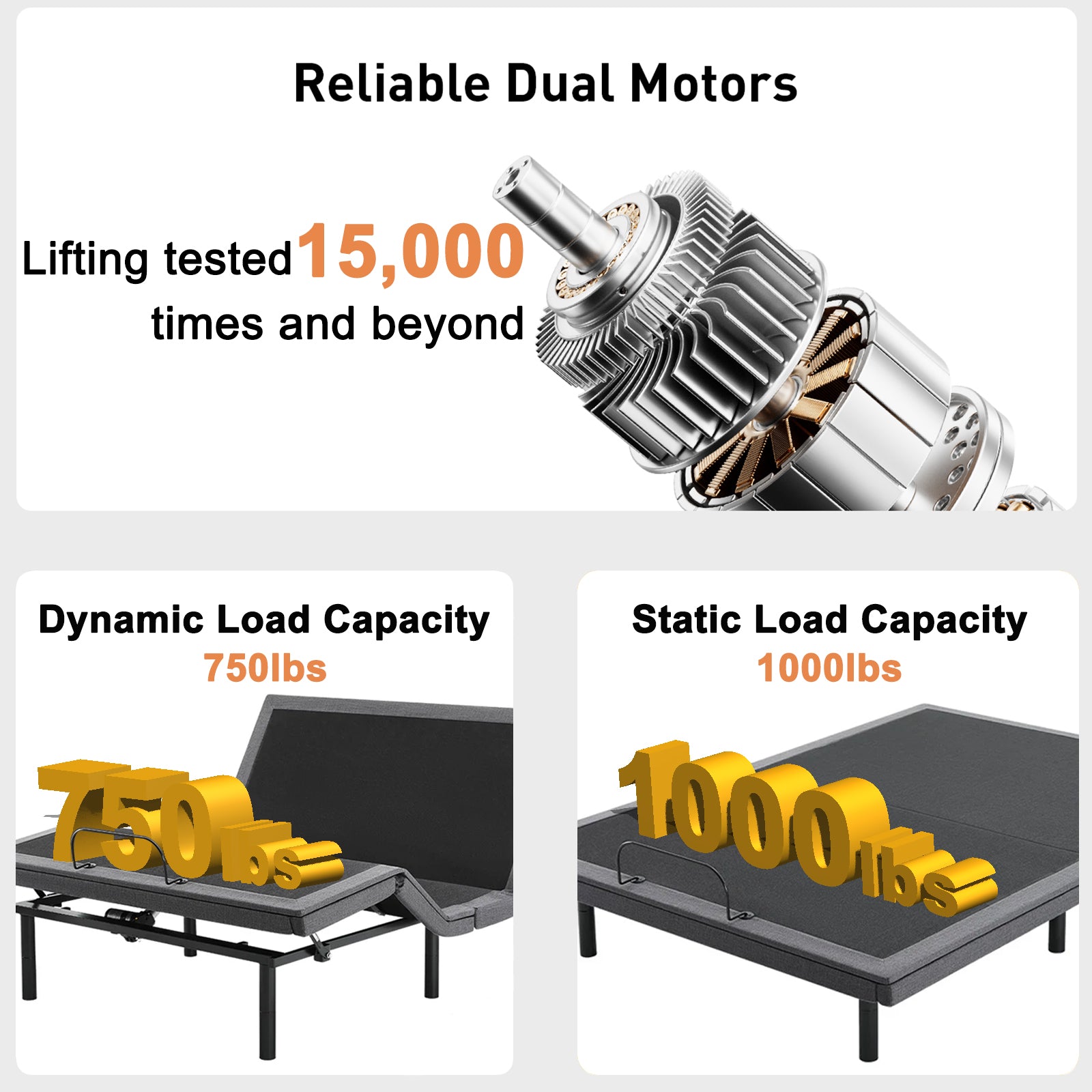 - Powerful & Durable Dual Quiet Motors:The adjustable bed frame is equipped with reliable dual quiet motors for noiseless operation, which ensures you sleep peacefully and undisturbed all night long. And tested for over 15,000 lift cycles, this adjustable bed base ensures long-lasting performance. Built with high-strength steel for dynamic load capacity of 750 lbs and static load capacity of up to 1,000 lbs, it provides robust support and smooth adjustments for users of all sizes, day after day.