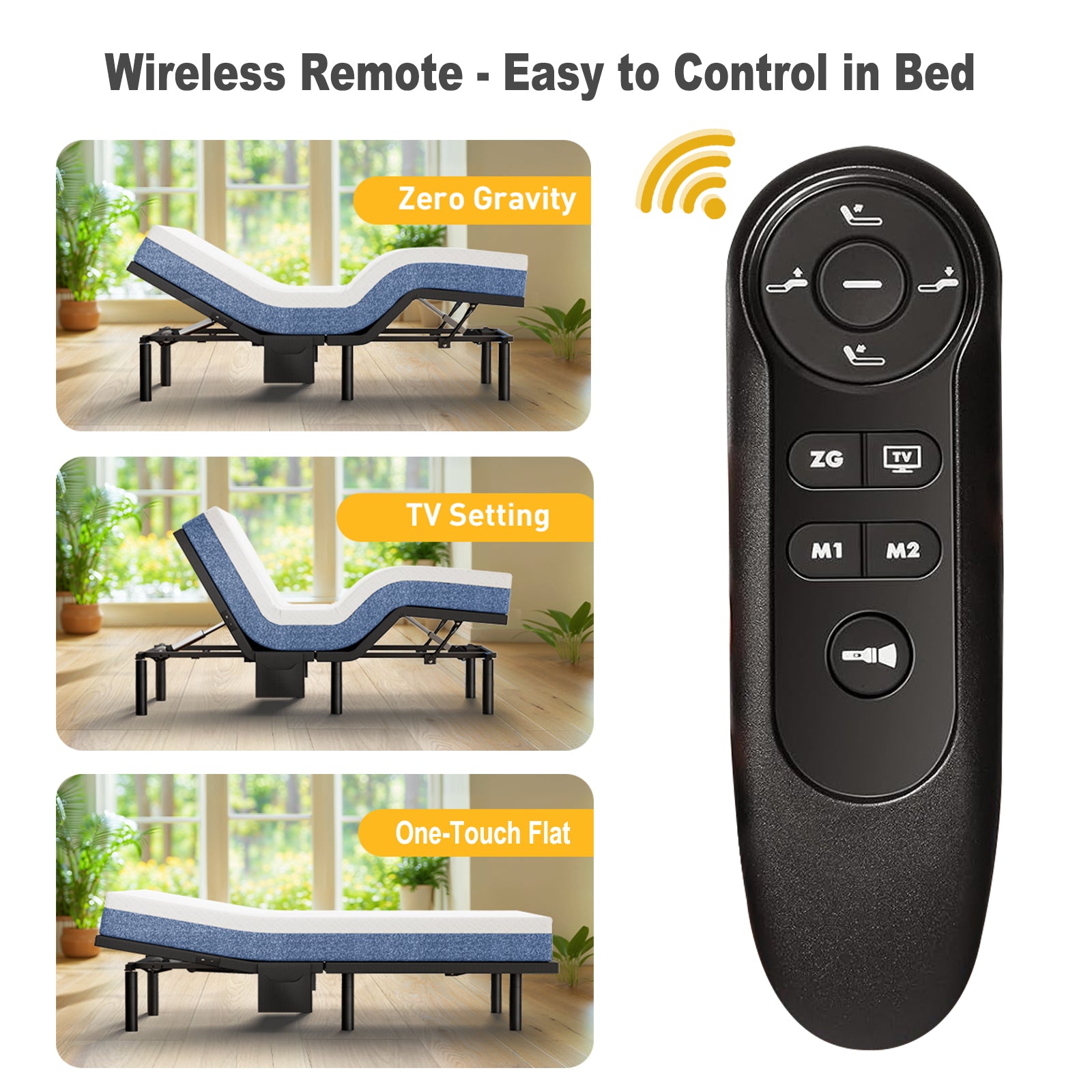 - 10-button Multifunctional Wireless Remote – Easy to Control in Bed:Master your perfect sleep position with effortless wireless control. Independently raise/lower the head & foot sections, activate zero-gravity mode, save two custom presets (M1/M2), instantly flatten the bed, optimize for TV viewing, and locate the remote via built-in flashlight—all through intuitive one-touch buttons.