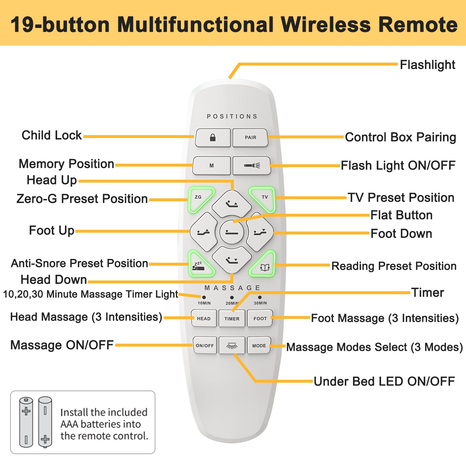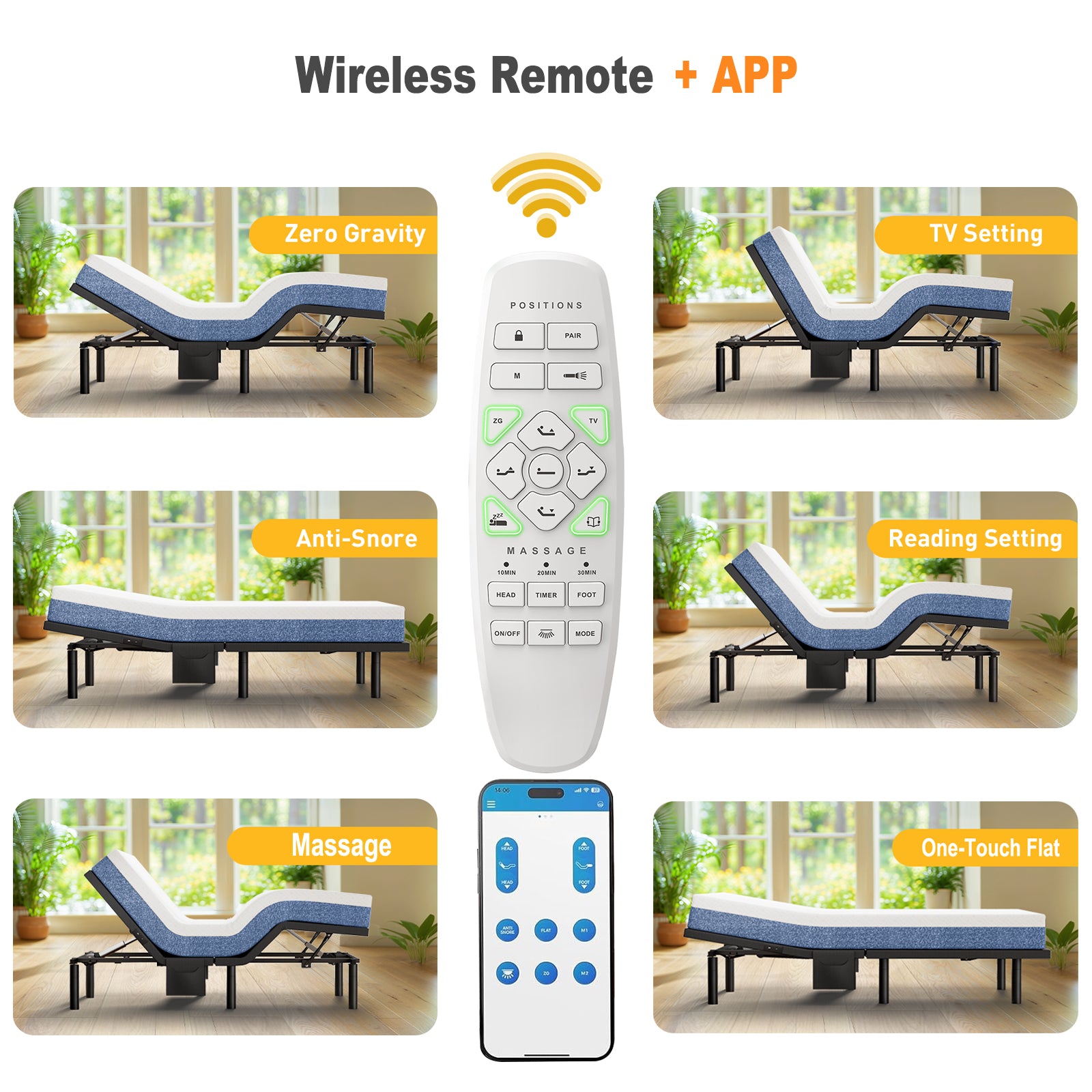 - 19-button Multifunctional Wireless Remote + App Connections:This upgraded wireless remote puts all the power of your adjustable bed frame at your fingertips. Easily customize your experience with dedicated preset buttons for Zero Gravity, Anti-Snore, TV, and Reading positions. Fine-tune your comfort with individual head and foot adjustments, and save your ideal setup with the memory function. Enjoy 3 massage intensities and 3 massage modes for both head and foot, along with a timer (10, 20, 30 mins) for auto shutoff. Extra features like child lock, built-in flashlight, underbed LED control, and one-touch flat mode provide enhanced convenience and safety—perfect for restful sleep and relaxing routines. These functions can also be easily controlled by connecting to the App—Compatible with iOS and Android.