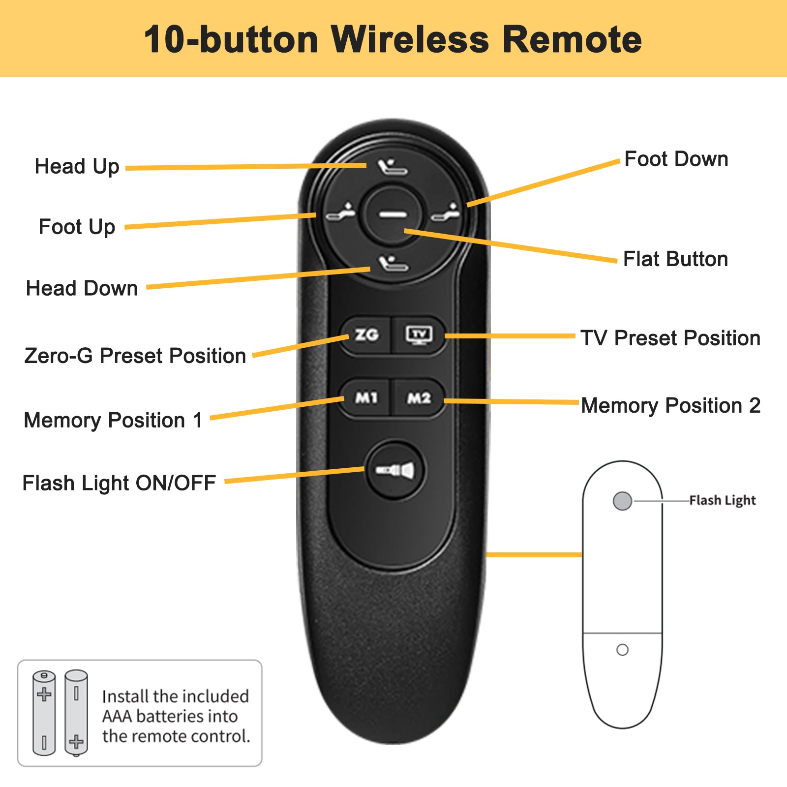 - Advanced 17-Button Wireless Remote: Effortlessly control massage, lighting, preset positions (Zero-G, Flat, TV, Reading, Anti-Snore), save 2 memory settings, and use features like child lock, flashlight, and more.