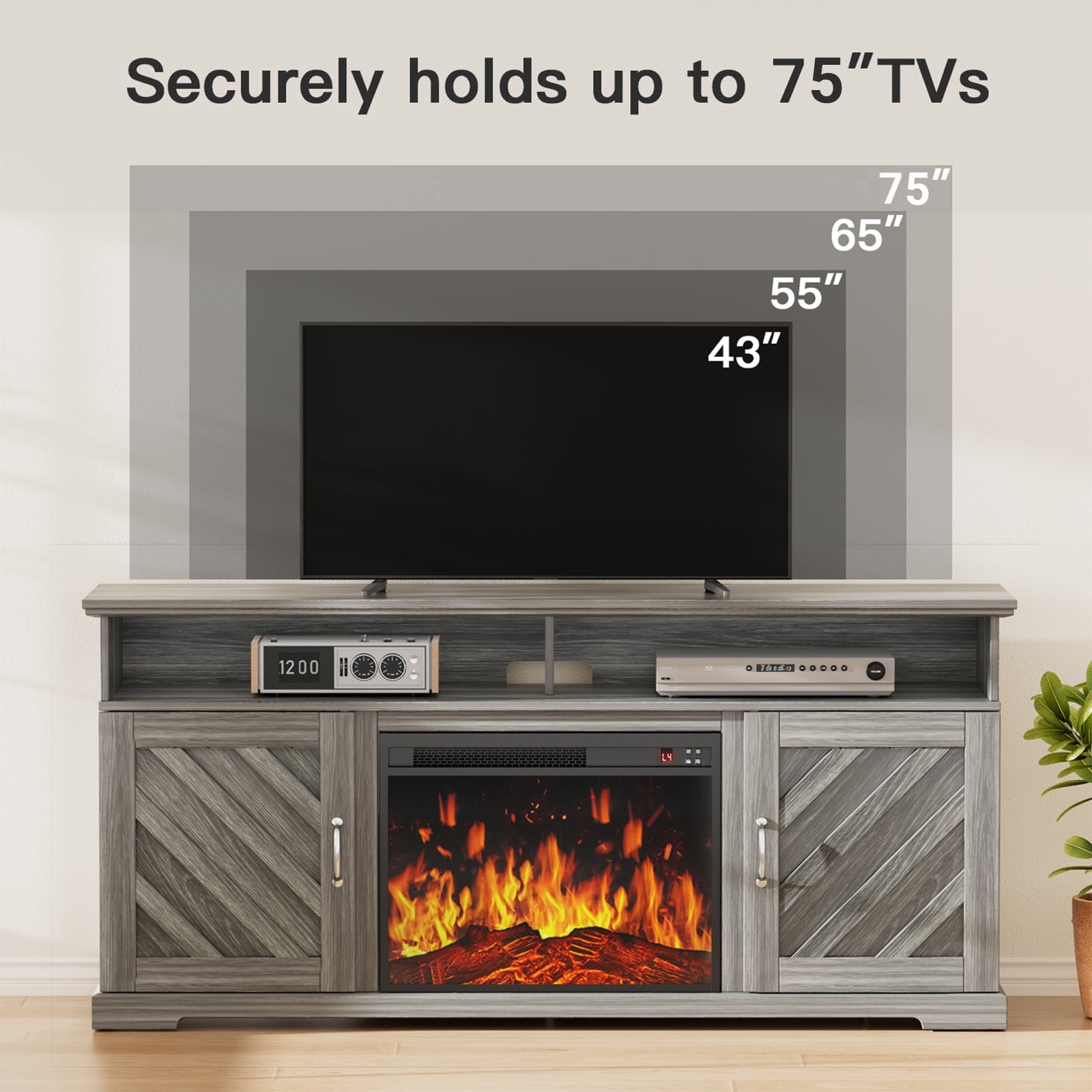 - Ample Flexible Storage: Overall size: 58.78 x 28.95 x 14.17 inch fireplace TV stand for 65, 70, 75 inch TV. 2 barn door cabinets with adjustable shelves can store your decoration or gaming equipment. With an open-top compartment to store a soundbar or DVD, and 3 cable management cutouts on the back to manage wires. This fireplace entertainment center keeps the room tidy and organized.