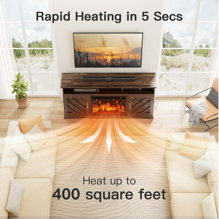 - Ample Flexible Storage: Overall size: 58.78 x 28.95 x 14.17 inch fireplace TV stand for 65, 70, 75 inch TV. 2 barn door cabinets with adjustable shelves can store your decoration or gaming equipment. With an open-top compartment to store a soundbar or DVD, and 3 cable management cutouts on the back to manage wires. This fireplace entertainment center keeps the room tidy and organized.