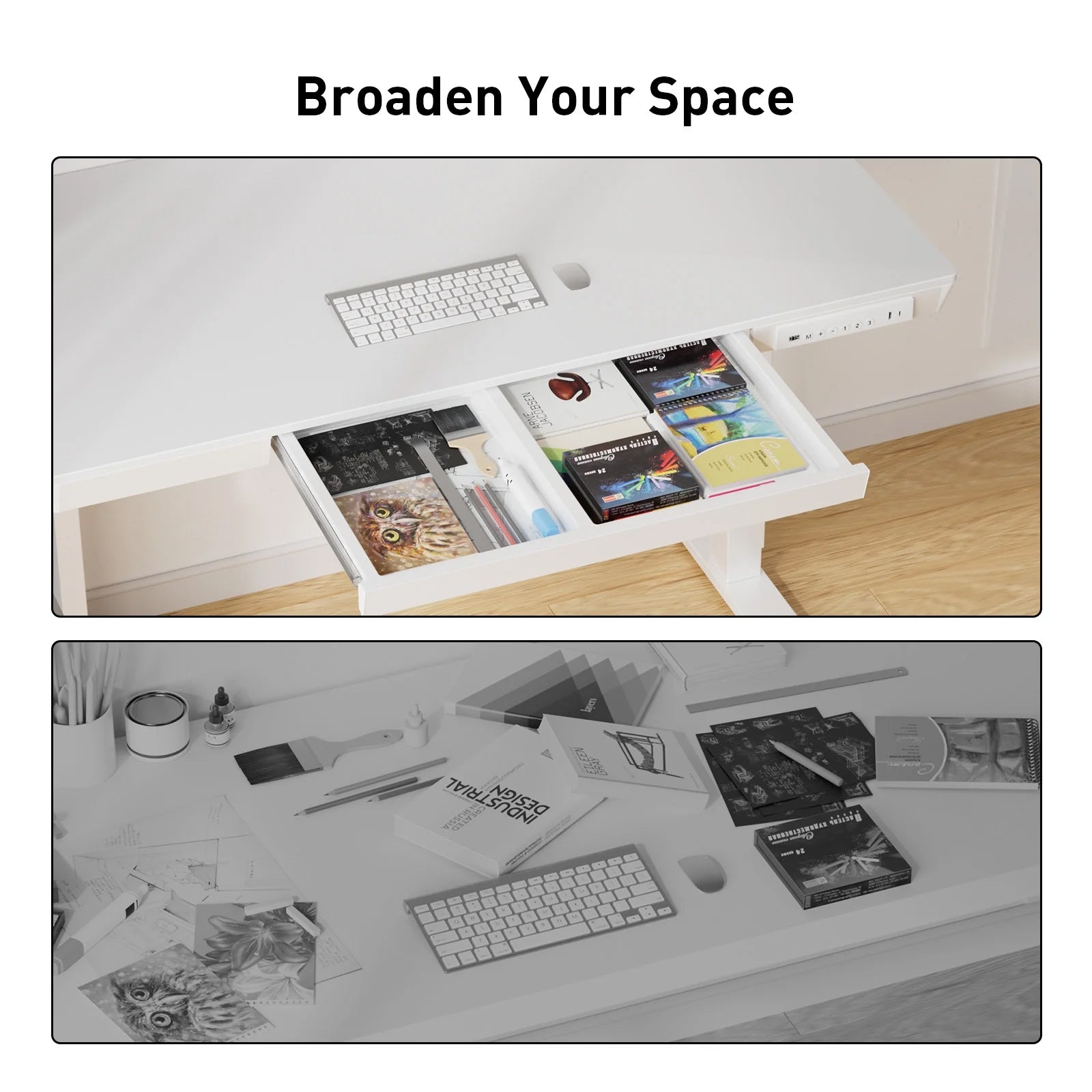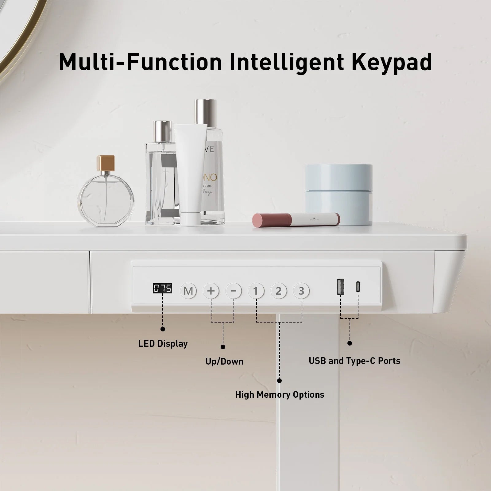 The Height-Adjustable Standing Desk is a multifunctional and stylish solution for modern living. With an extended height adjustment range, versatile charging ports, a spacious organized drawer, and anti-collision safety, it adapts to various needs. Whether used as a workstation in your office or a vanity table in your bedroom, this desk combines elegance with practicality to enhance your daily life.