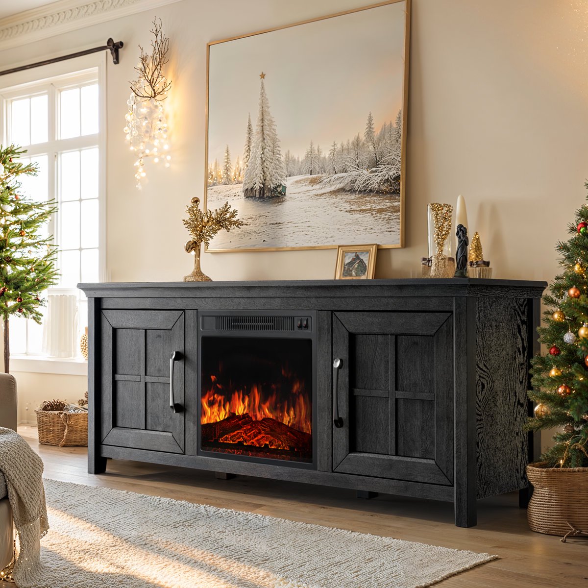 👉Safe and Sturdy Quality: High-quality particle board with 6 legs on the bottom, ensuring more stability of electric apparatus. Smooth metal handles for easy accessing to your stuff in the closed cabinets. Use easy with our fireplace safety guarantee, featuring overheat protection and ETL/FCC certifications. Holds up to 220 lbs with ease.