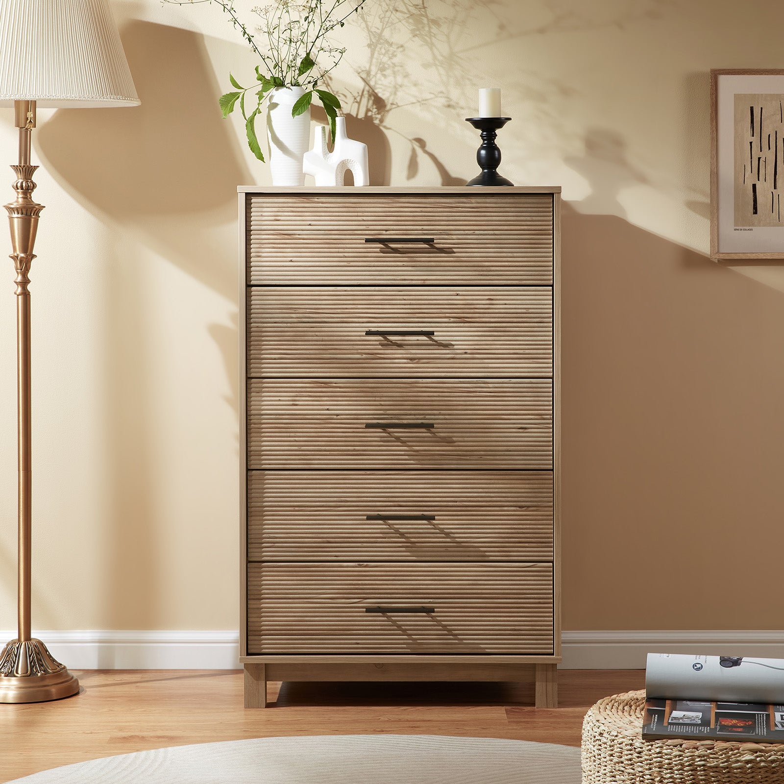 CHITOOMA Fluted Dresser for Bedroom, Modern Wooden 5 Drawer Tall Dresser, Chest of Drawers, Storage Cabine Living Room Hallway, Natural
