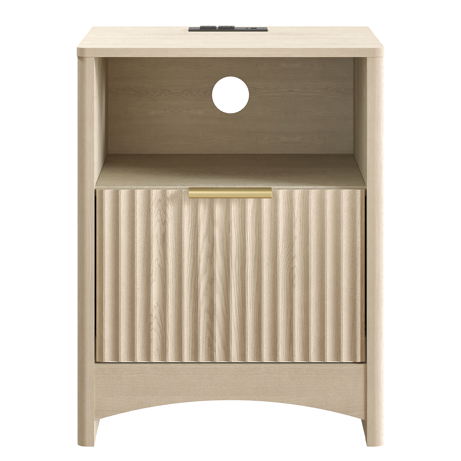 Add warmth and functionality to your space with this modern natural wood nightstand. Featuring a clean-lined silhouette with subtly fluted drawer fronts, this bedside table is the perfect combination of minimalist style and practical storage. The roomy drawers and open top shelf keep your nighttime essentials close at hand, while the natural wood grain finish brings a calming, organic feel to your bedroom or living space.