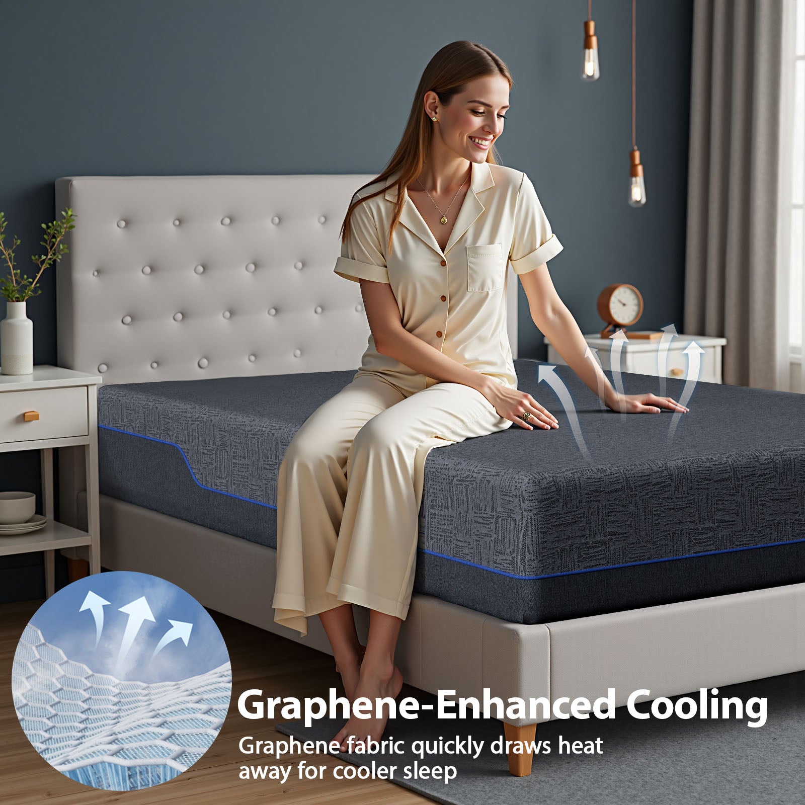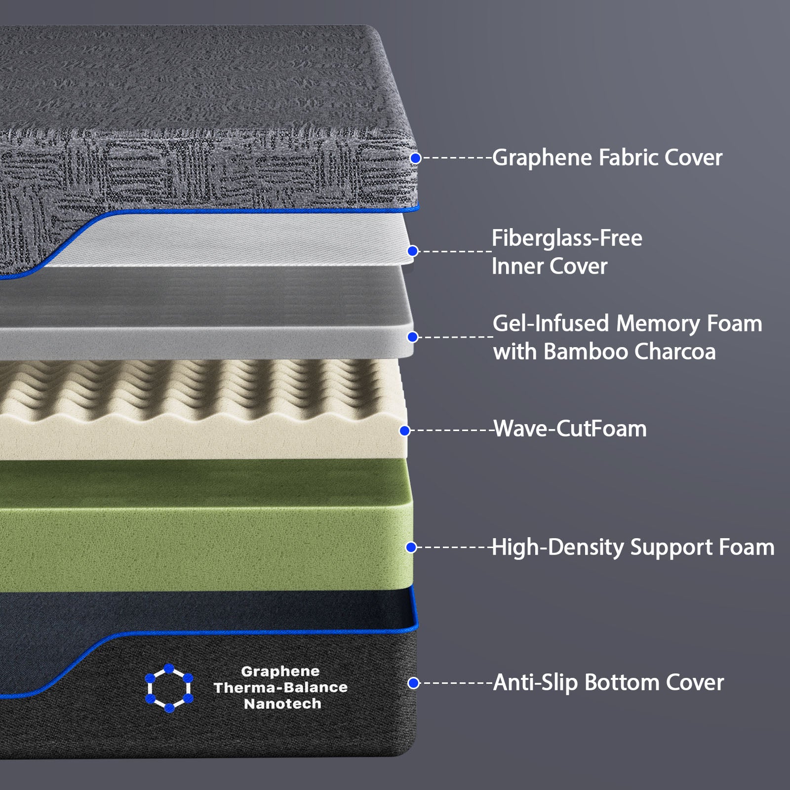 12-Inch Gel Memory Foam Mattress with Graphene Cover:This premium full memory foam mattress features a triple-layer structure: gel-infused memory foam for cooling, wave-cut airflow foam for ventilation, and high-density base foam for stability and spinal alignment. The removable graphene-infused cover offers enhanced temperature regulation and easy cleaning, keeping your bed fresh and cool all night.
