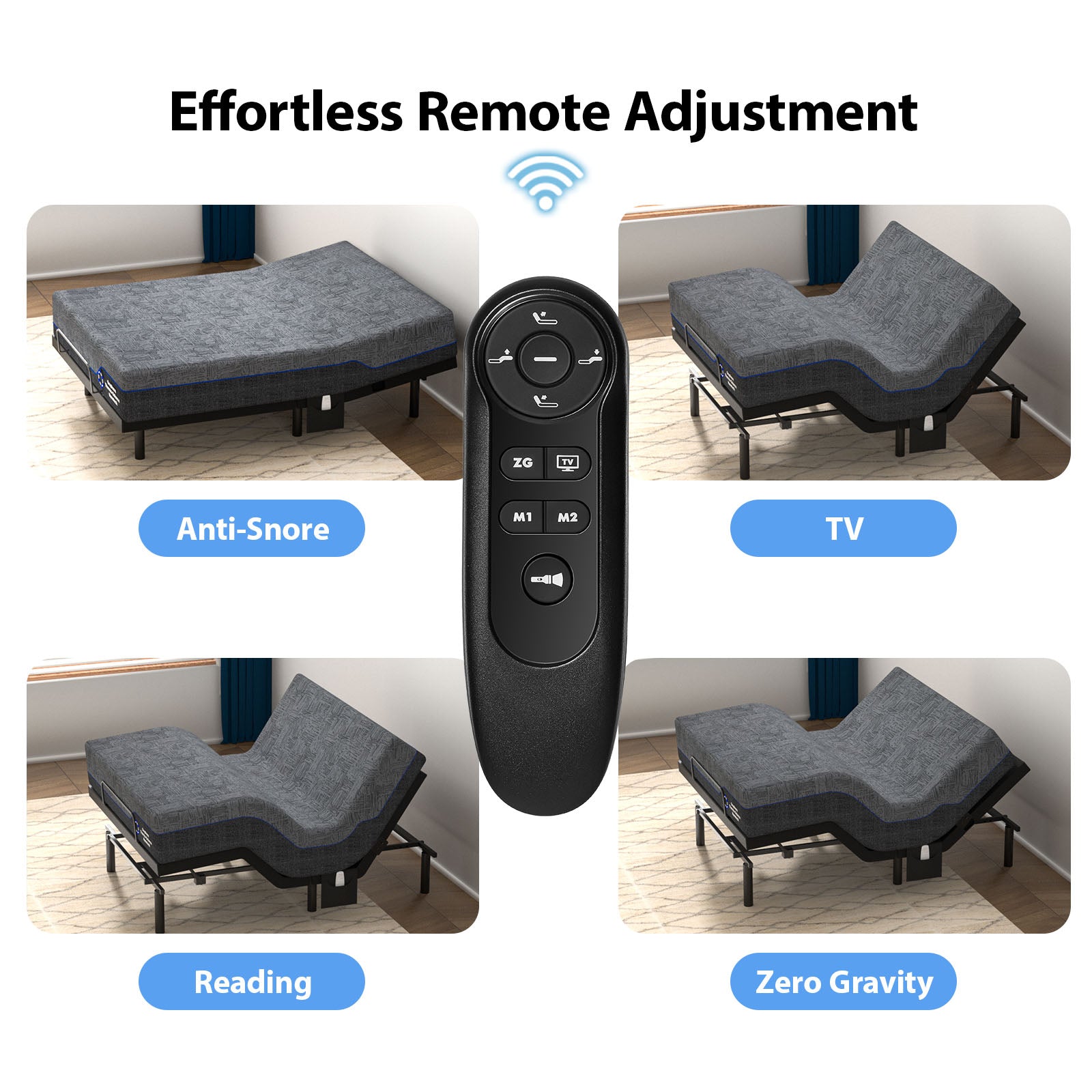 - 10-button Multifunctional Wireless Remote – Easy to Control in Bed:Master your perfect sleep position with effortless wireless control. Independently raise/lower the head & foot sections, activate zero-gravity mode, save two custom presets (M1/M2), instantly flatten the bed, optimize for TV viewing, and locate the remote via built-in flashlight—all through intuitive one-touch buttons.