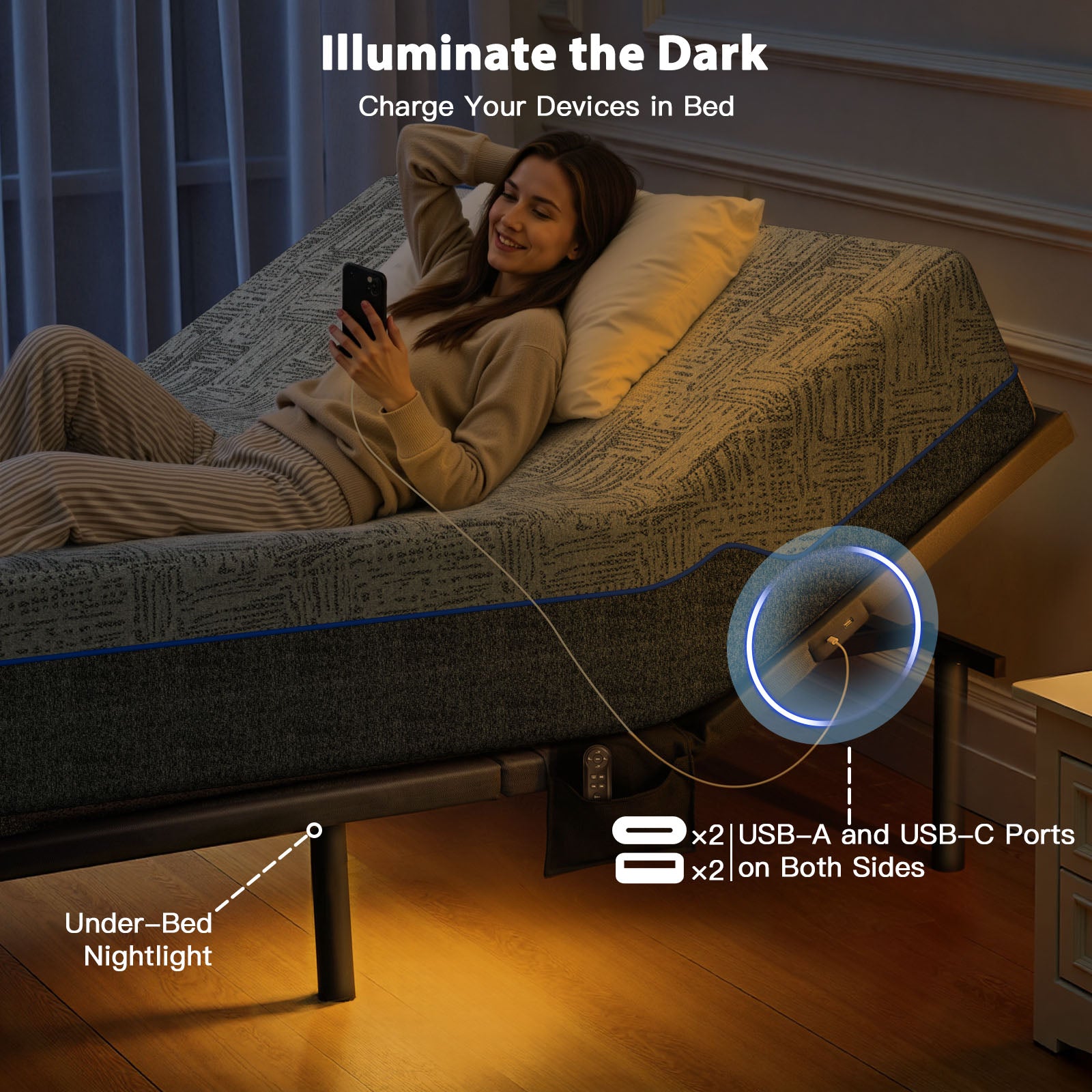 - Convenient USB Charging & Under-Bed LED Lighting:Equipped with 4 USB ports (2 Type-A + 2 Type-C) on both sides, you can easily charge phones, tablets, and other devices while relaxing. The under-bed LED nightlight provides gentle illumination with a 5-minute automatic shutoff, creating a cozy and energy-efficient sleep environment.