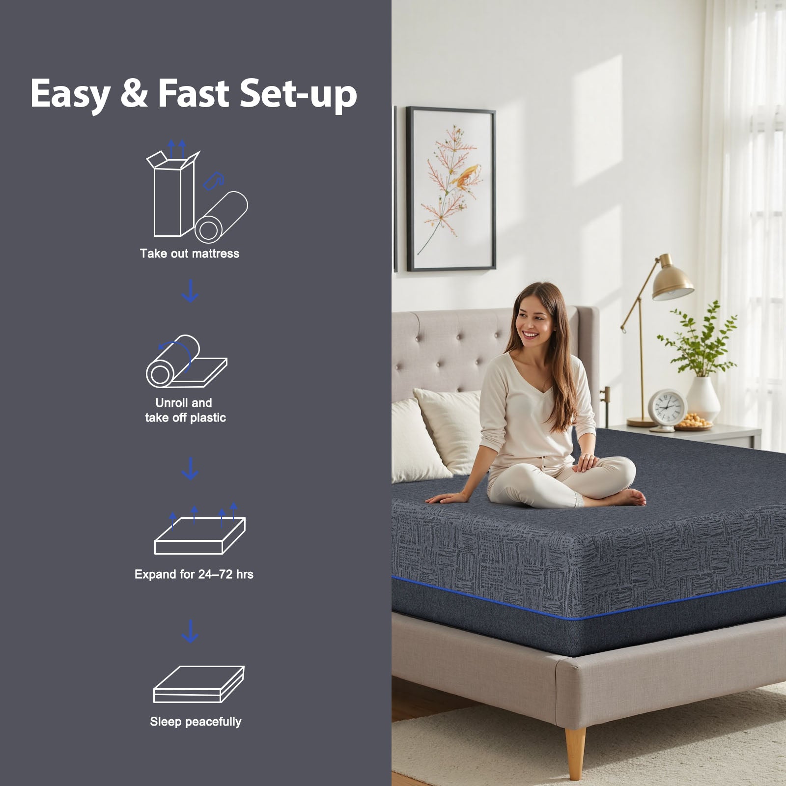 Note:the bed frame and mattress will be shipped in 2 separate packages, and the packages may not arrive at the same time. - Medium-Firm Plus Support for All Sleep Positions:Engineered with 3 lbs of high-density foam, the mattress provides a medium-firm plus feel that perfectly balances comfort and support. Ideal for back, side, and stomach sleepers, it relieves pressure points and promotes a healthy spinal posture for deeper, restorative sleep.