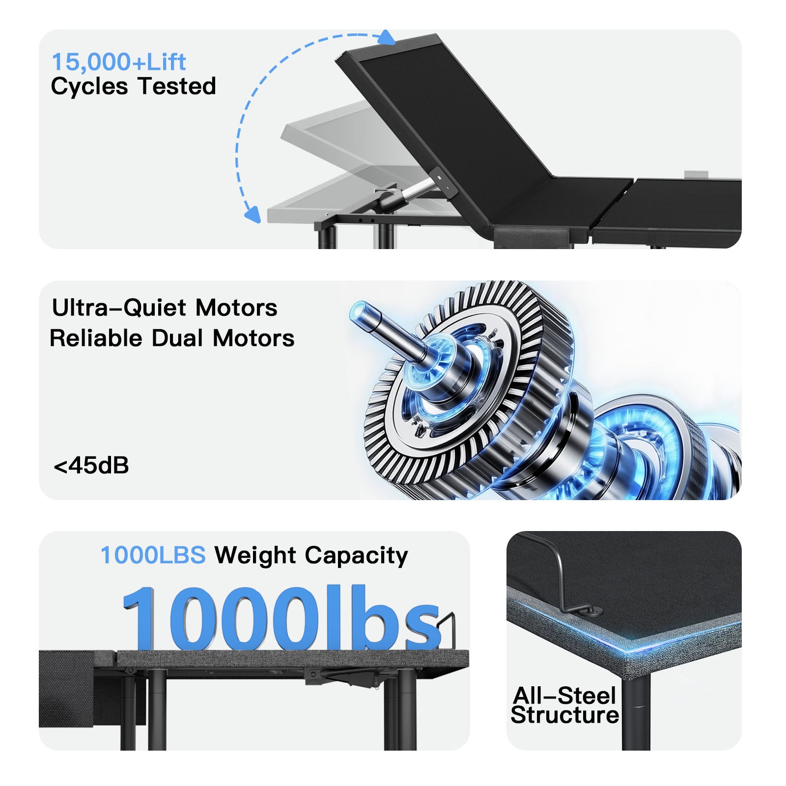 - Adjustable Leg Heights & Solid Steel Frame:Four optional leg heights (8", 10", 11", and 13") allow you to customize the bed’s height and create extra under-bed storage. The reinforced steel structure supports up to 1,000 lbs and ensures stability with dual quiet motors tested for over 15,000 lift cycles—smooth, silent, and durable.