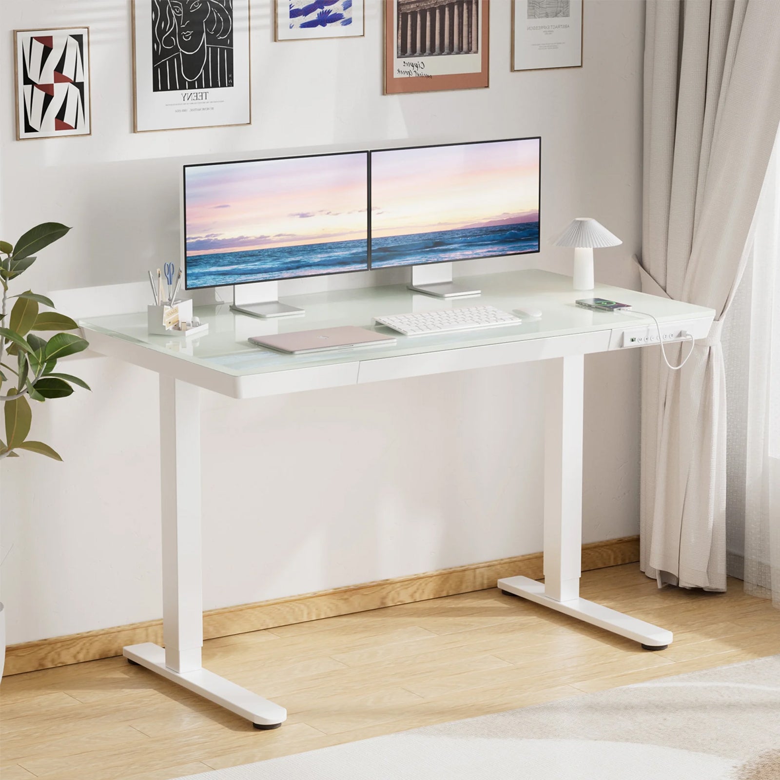 CHITOOMA Glass Top Electric Standing Desk with Drawer, 48'' x 24'' Electric Height Adjustable Desk with USB Charging Ports, Sit Stand up for Home Office
