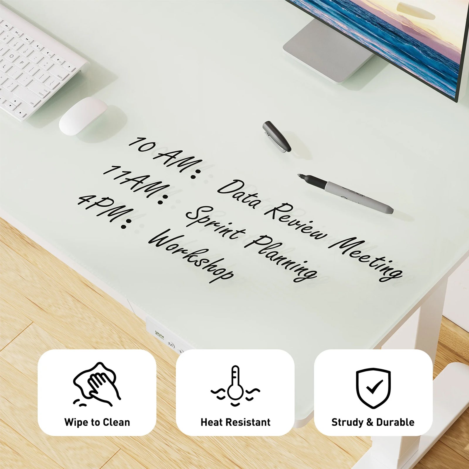 - Premium Tempered Glass Top & Sleek Design. Upgrade your workspace with this electric standing desk featuring a scratch-resistant tempered glass desktop, perfect for writing, working, or sketching. The smooth surface is waterproof, stain-proof, and easy to clean, combining modern aesthetics with durable functionality. Ideal for home offices or contemporary workspaces.