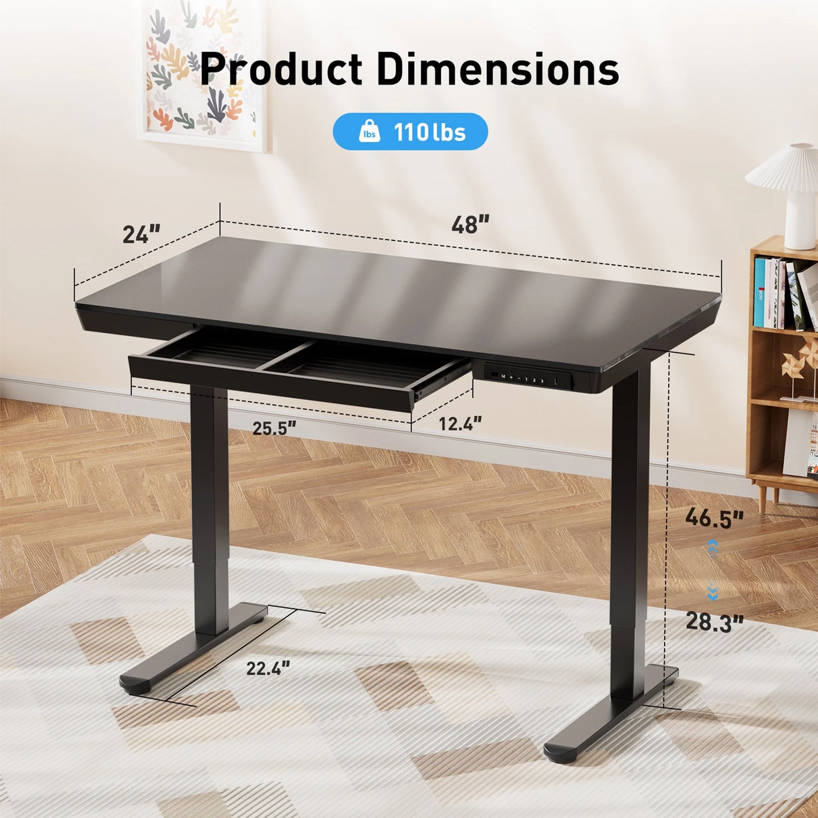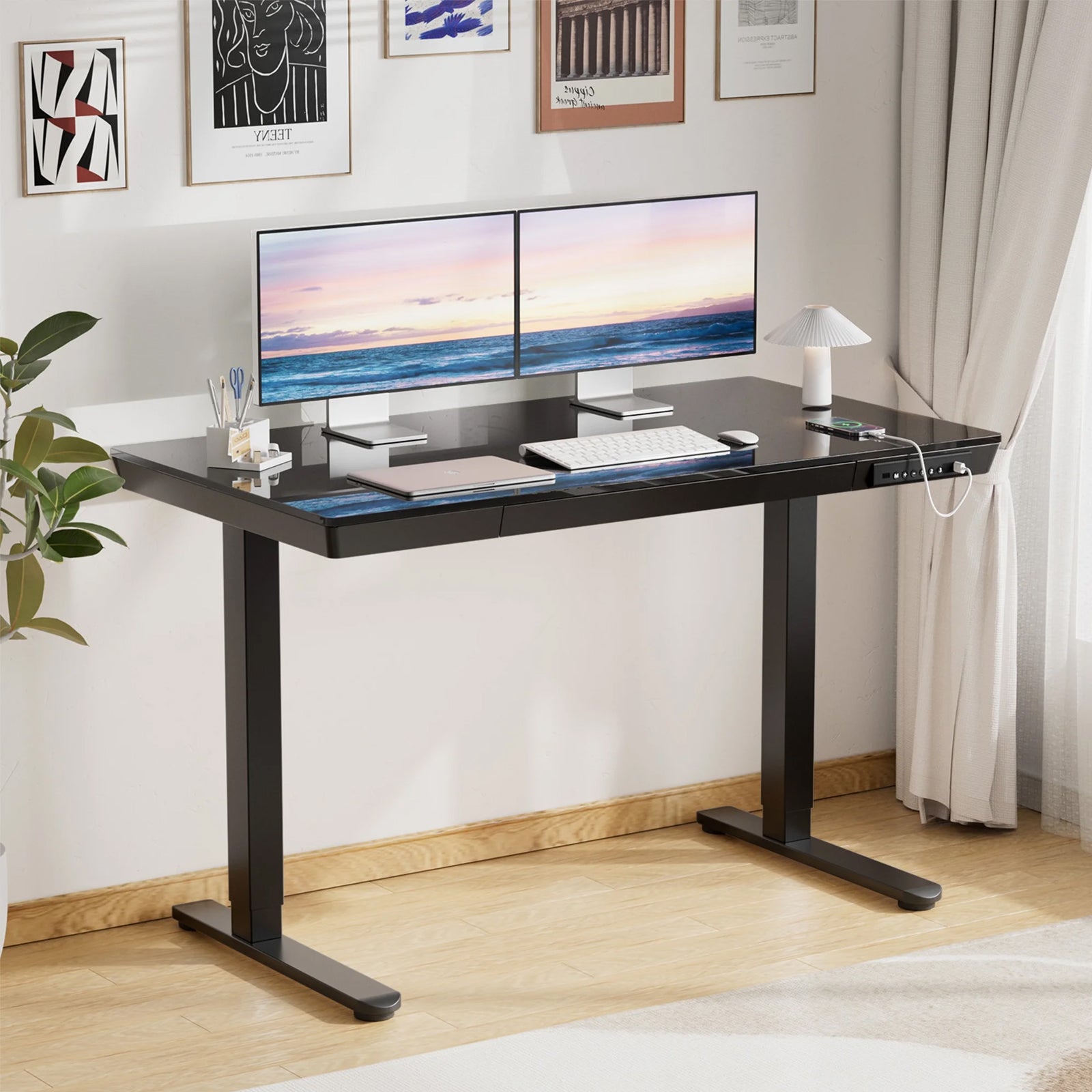 CHITOOMA Glass Top Electric Standing Desk with Drawer, 48'' x 24'' Electric Height Adjustable Desk with USB Charging Ports, Sit Stand up for Home Office