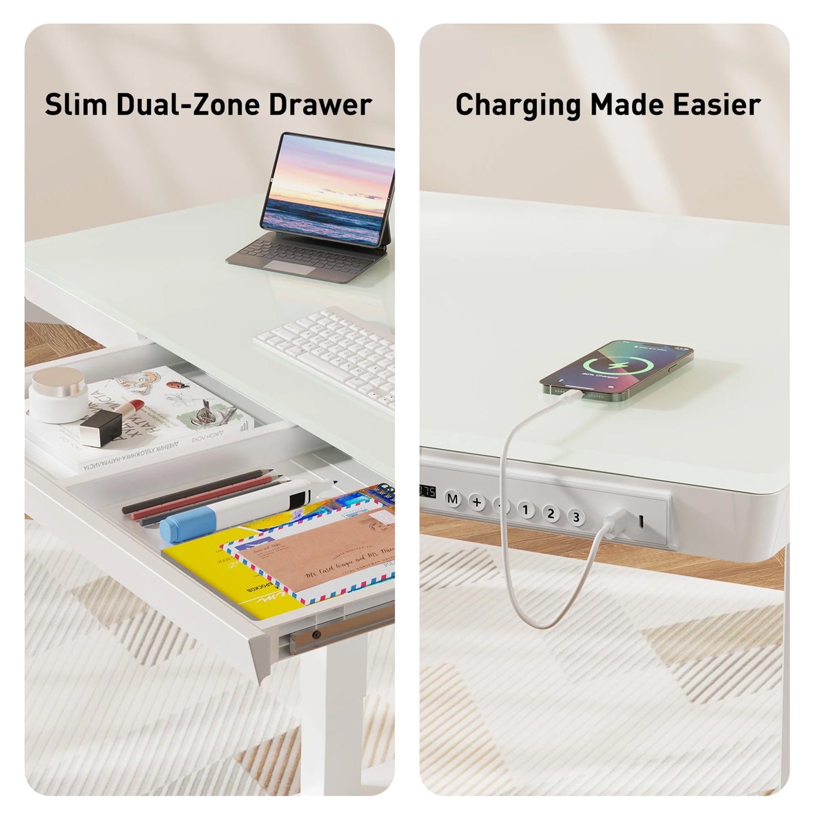 CHITOOMA Glass Top Electric Standing Desk with Drawer, 55'' x 28'' Electric Height Adjustable Desk with USB Charging Ports, Sit Stand up for Home Office