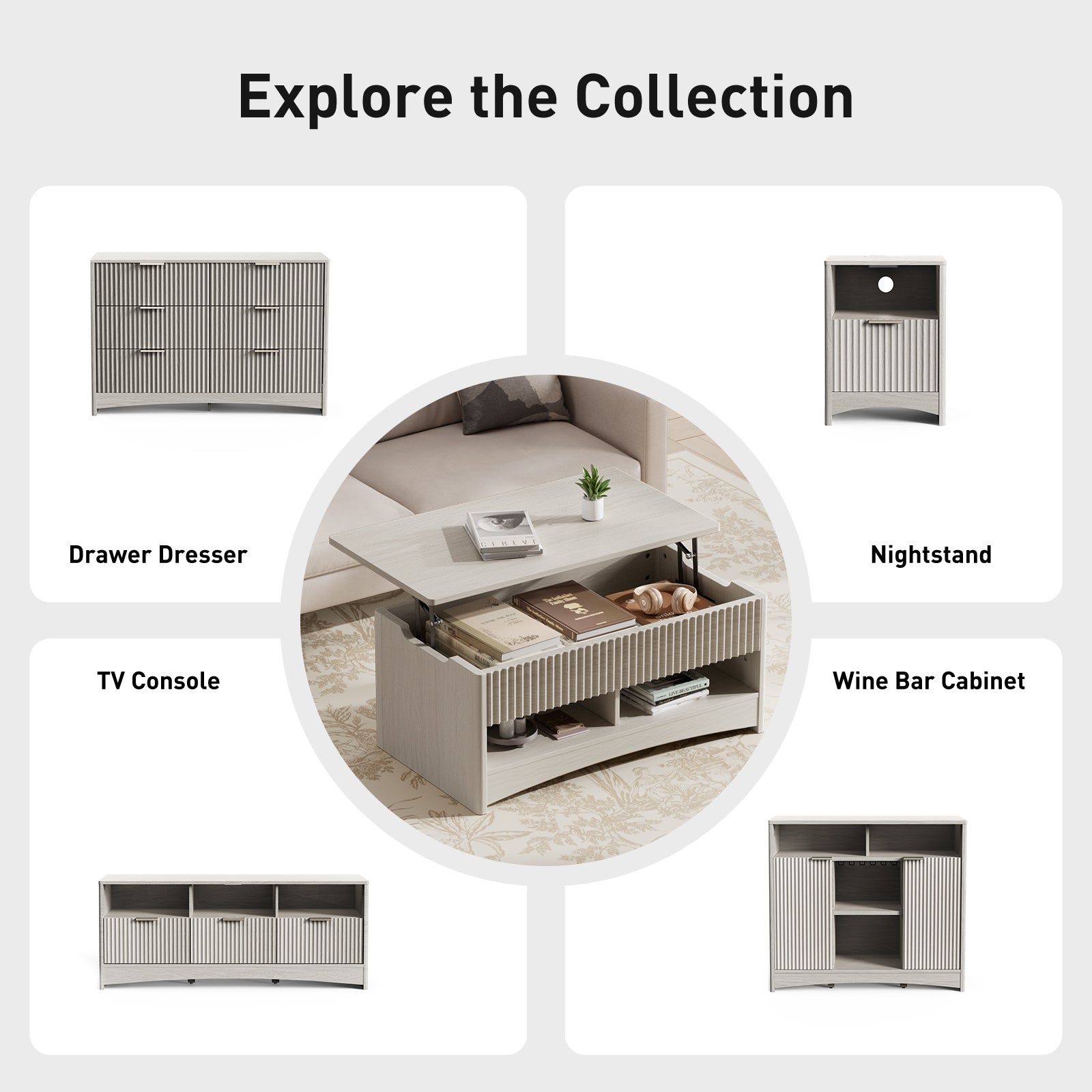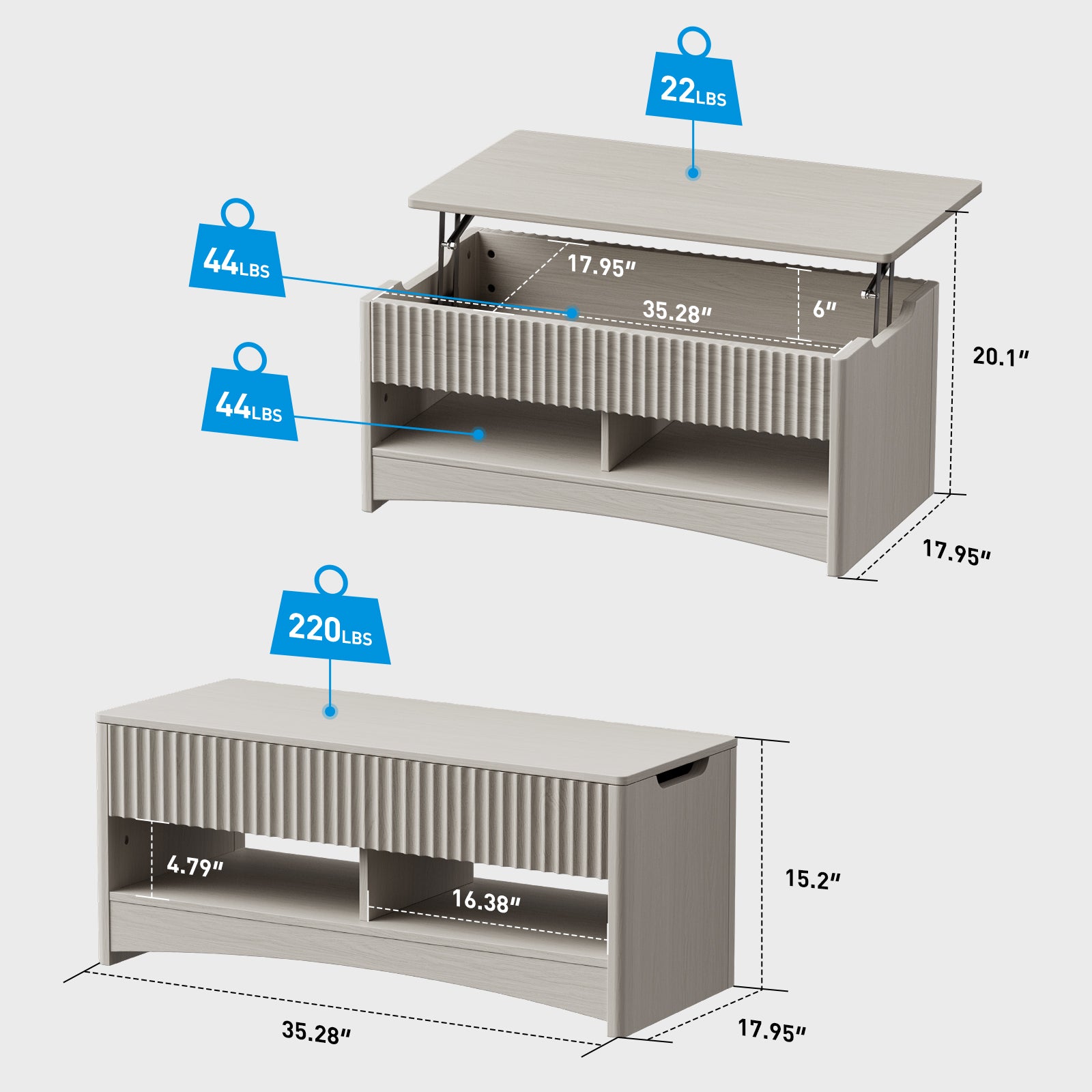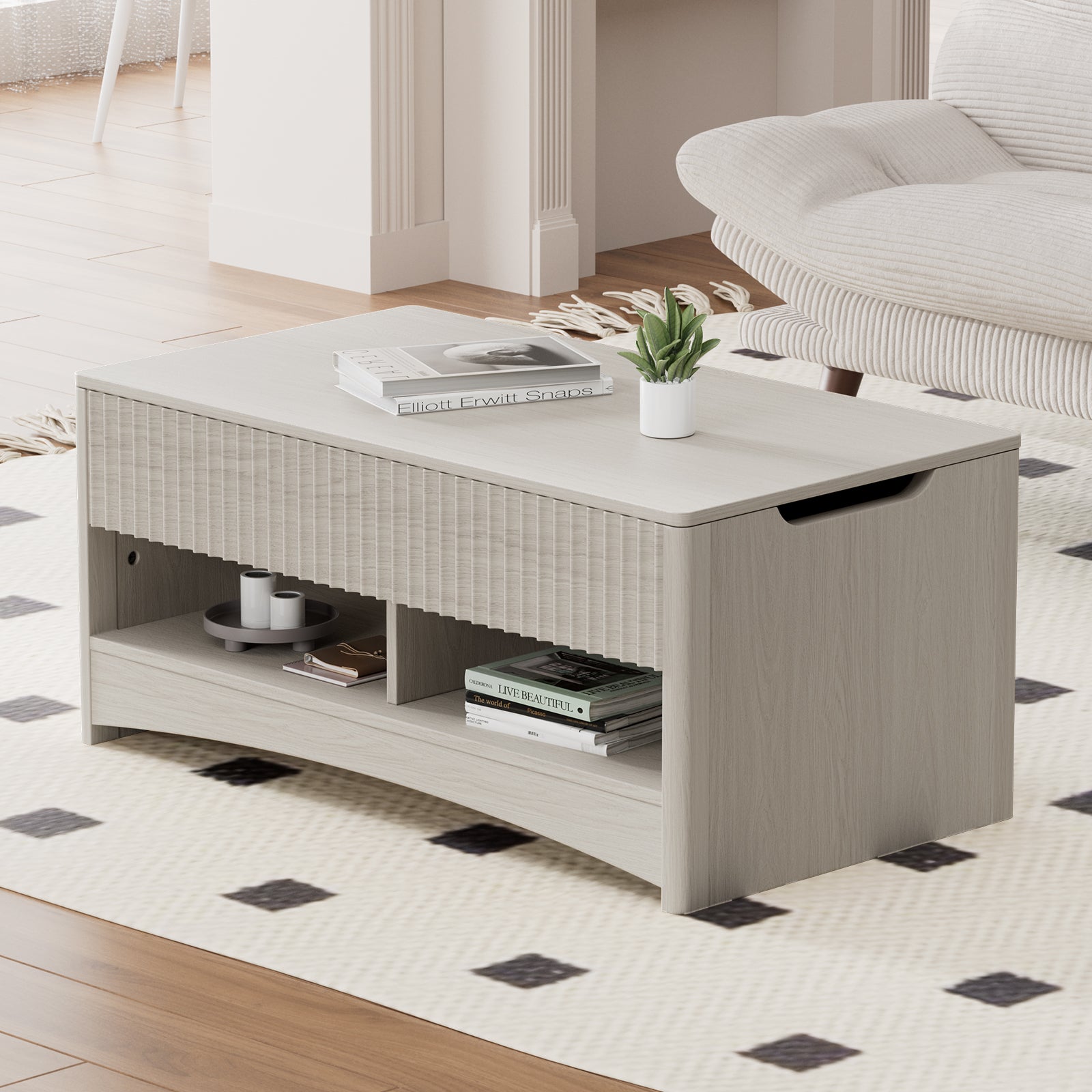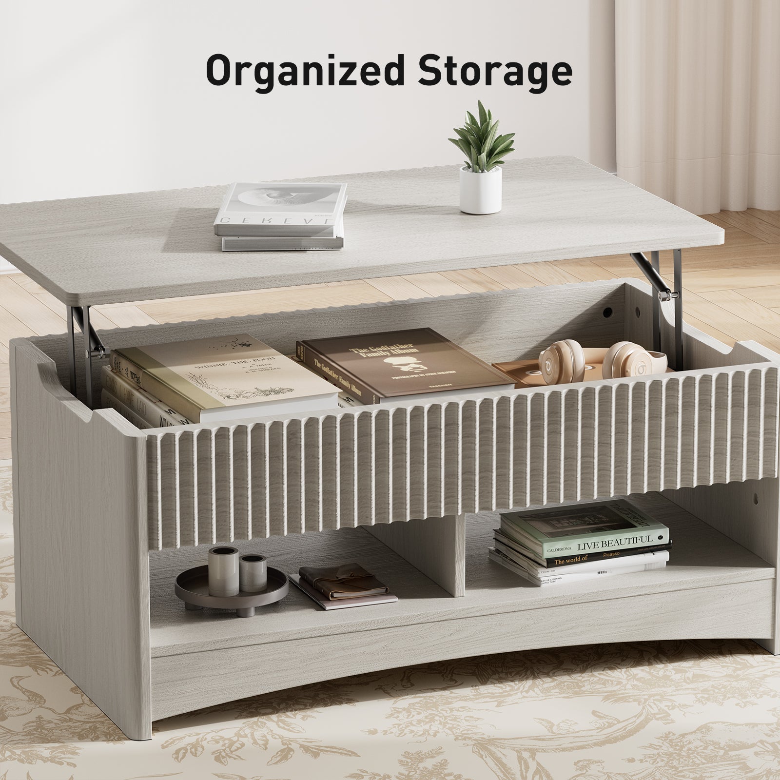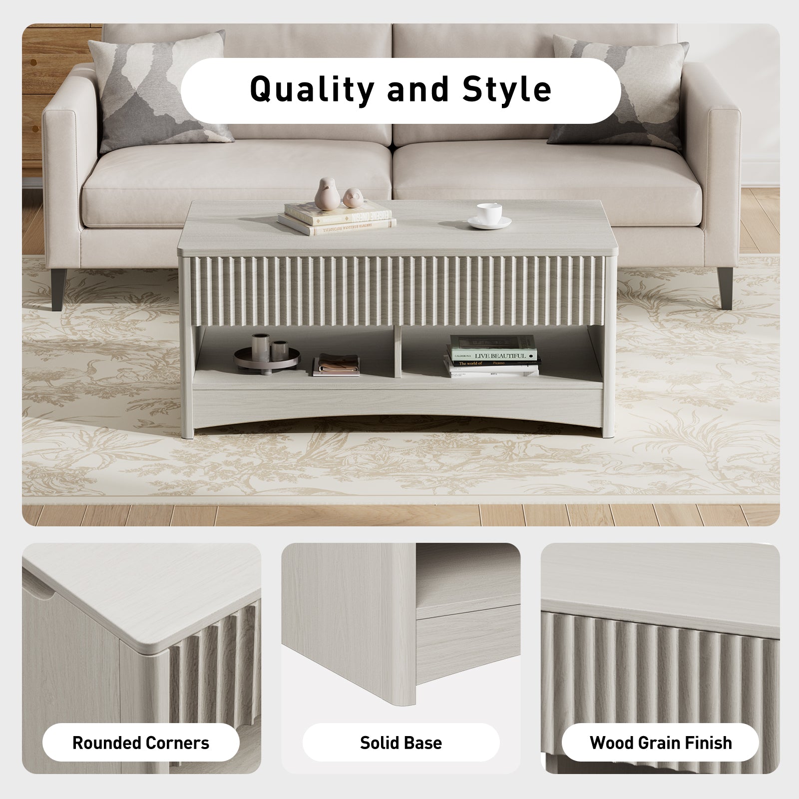 CHITOOMA Modern Lift-Top Coffee Table with Hidden Storage & Open Shelves, Fluted Front Accent Table for Living Room, Gray