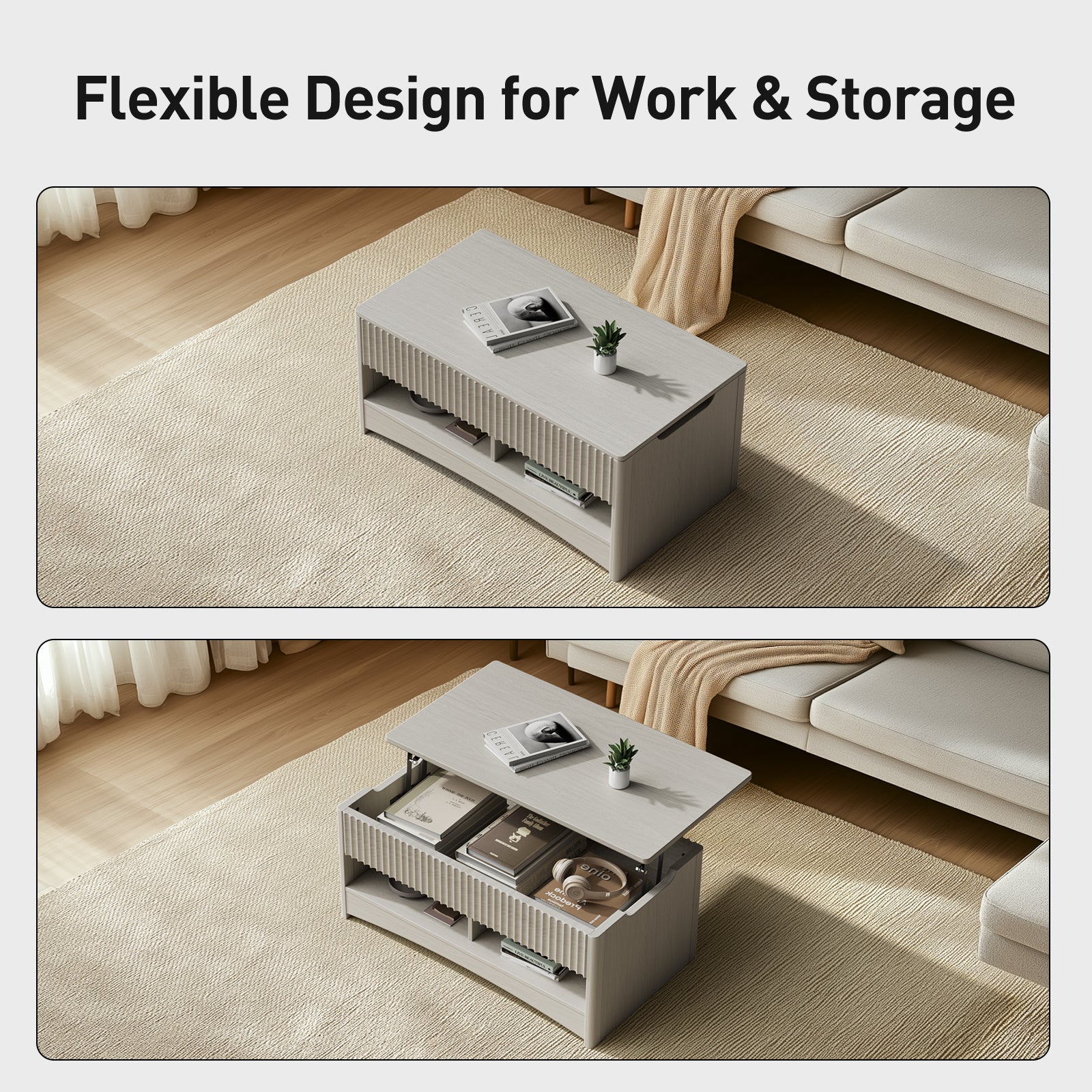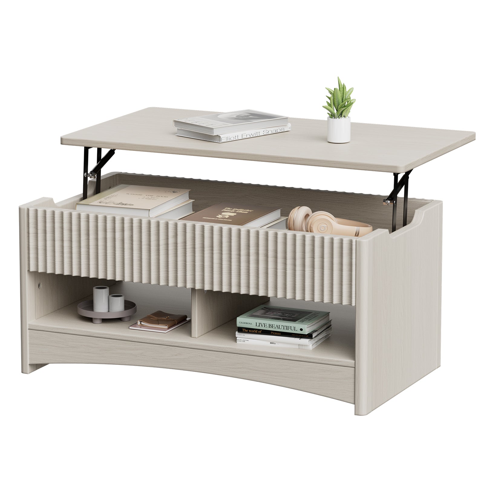 Elevate your living space with the CHITOOMA modern lift-top coffee table. Designed with a fluted front and soft natural oak finish, this stylish table features a lift-top design that reveals hidden storage and dual open shelves, perfect for organizing your living room essentials while adding a touch of contemporary charm.