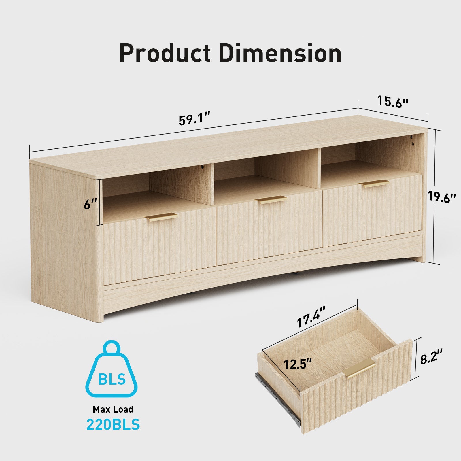 Add both function and flair to your living space with the CHITOOMA 60" TV Stand. Featuring a modern fluted front with gold-tone handles, this media console offers a stylish look along with spacious open shelves and concealed cabinets for smart organization. Supports TVs up to 65".