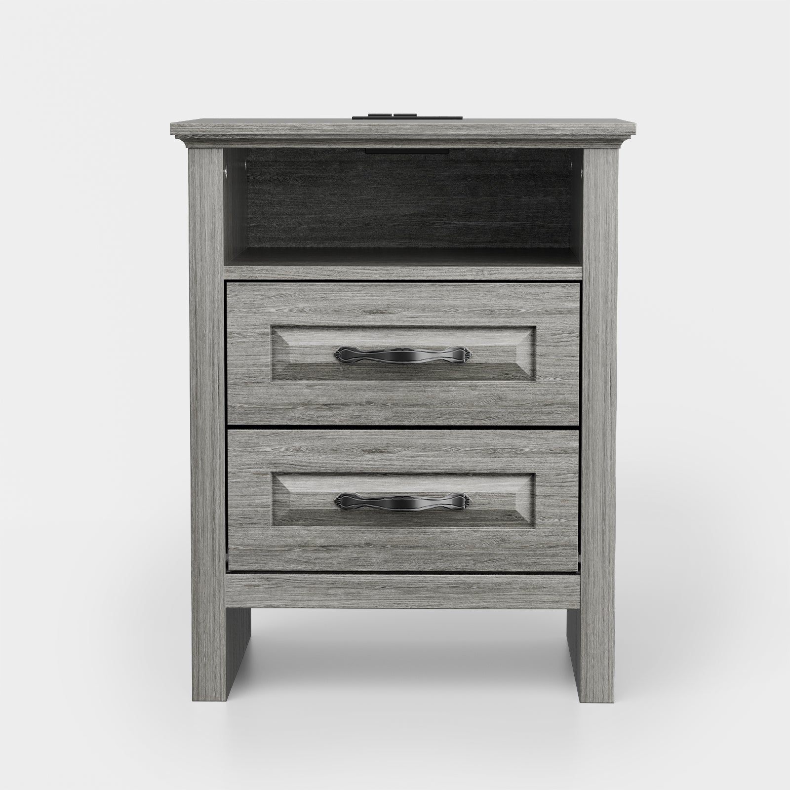 Upgrade your bedroom with this beautifully crafted mid-century modern nightstand that perfectly blends style and function. Designed with two spacious drawers and an open shelf, it provides practical bedside storage while doubling as an eye-catching accent piece. Designed for modern lifestyles, it features a built-in charging station with 2 AC outlets, 1 USB port, and 1 Type-C port—perfect for powering your phone, tablet, or night lamp without messy cords or extra adapters.