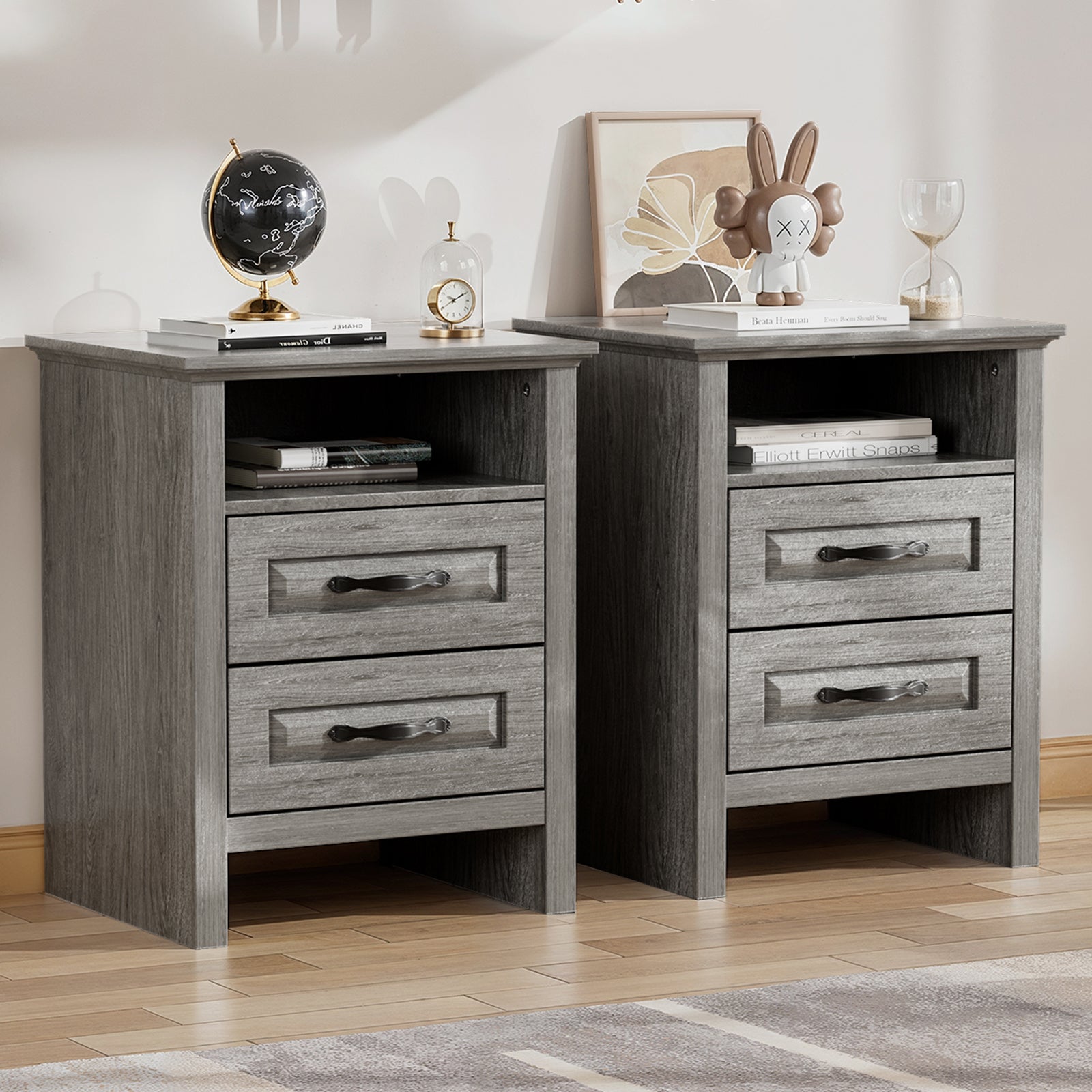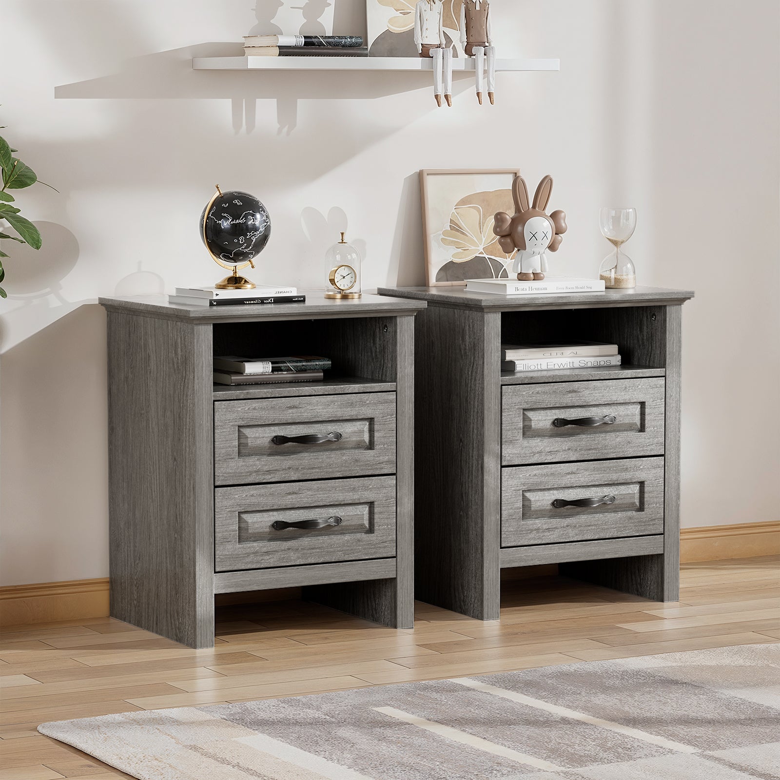 CHITOOMA Nightstand Set of 2 with Charging Station, 2-Drawer Wood Bedside Table with Open Shelf, Small End Table for Bedroom Living Room, Gray