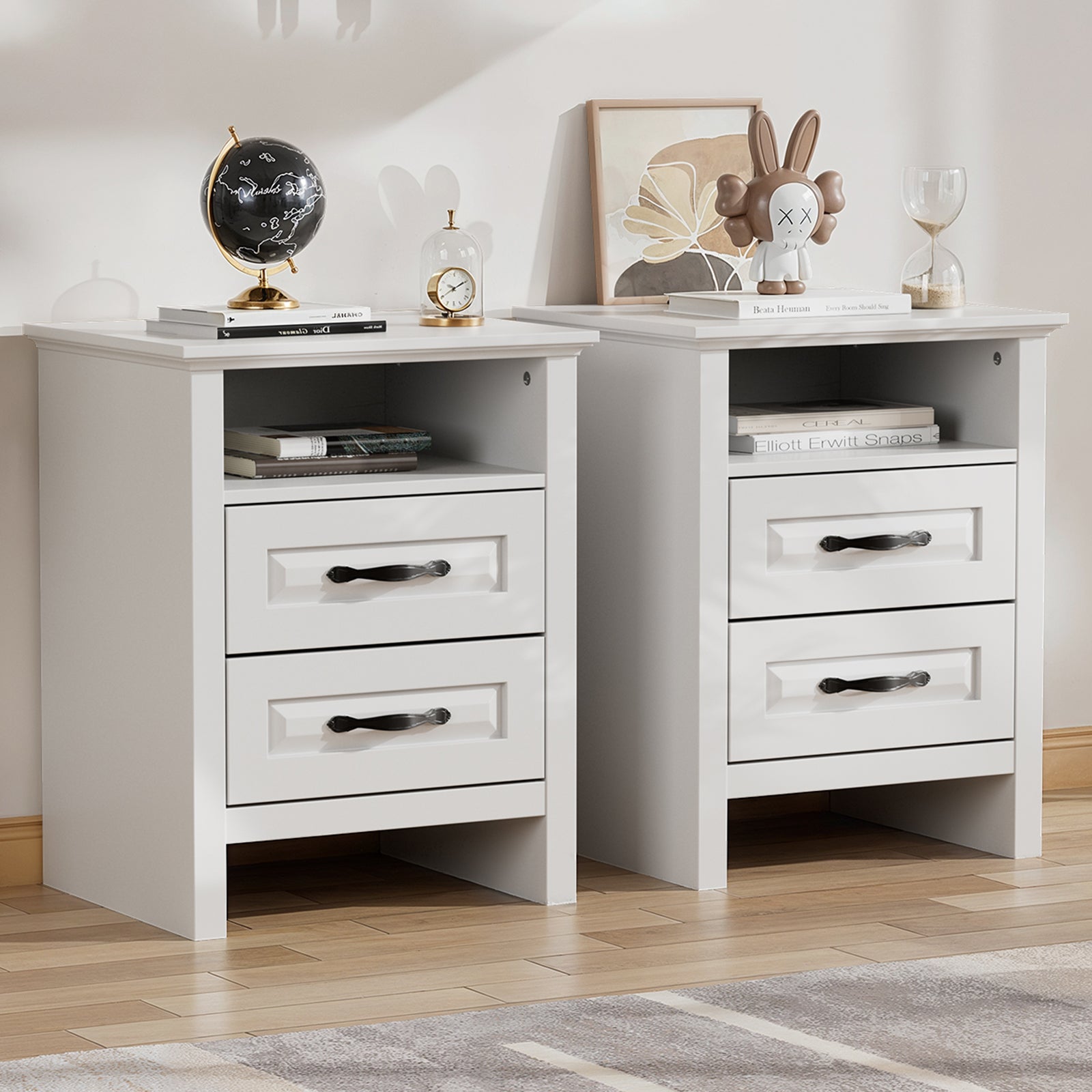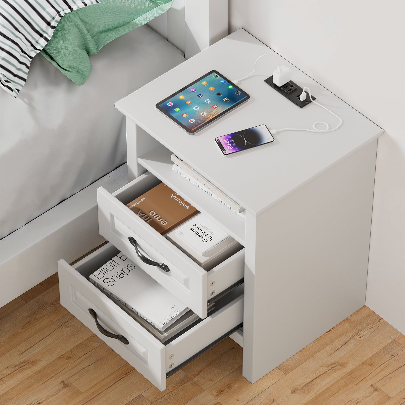 Upgrade your bedroom with this beautifully crafted mid-century modern nightstand that perfectly blends style and function. Designed with two spacious drawers and an open shelf, it provides practical bedside storage while doubling as an eye-catching accent piece. Designed for modern lifestyles, it features a built-in charging station with 2 AC outlets, 1 USB port, and 1 Type-C port—perfect for powering your phone, tablet, or night lamp without messy cords or extra adapters.