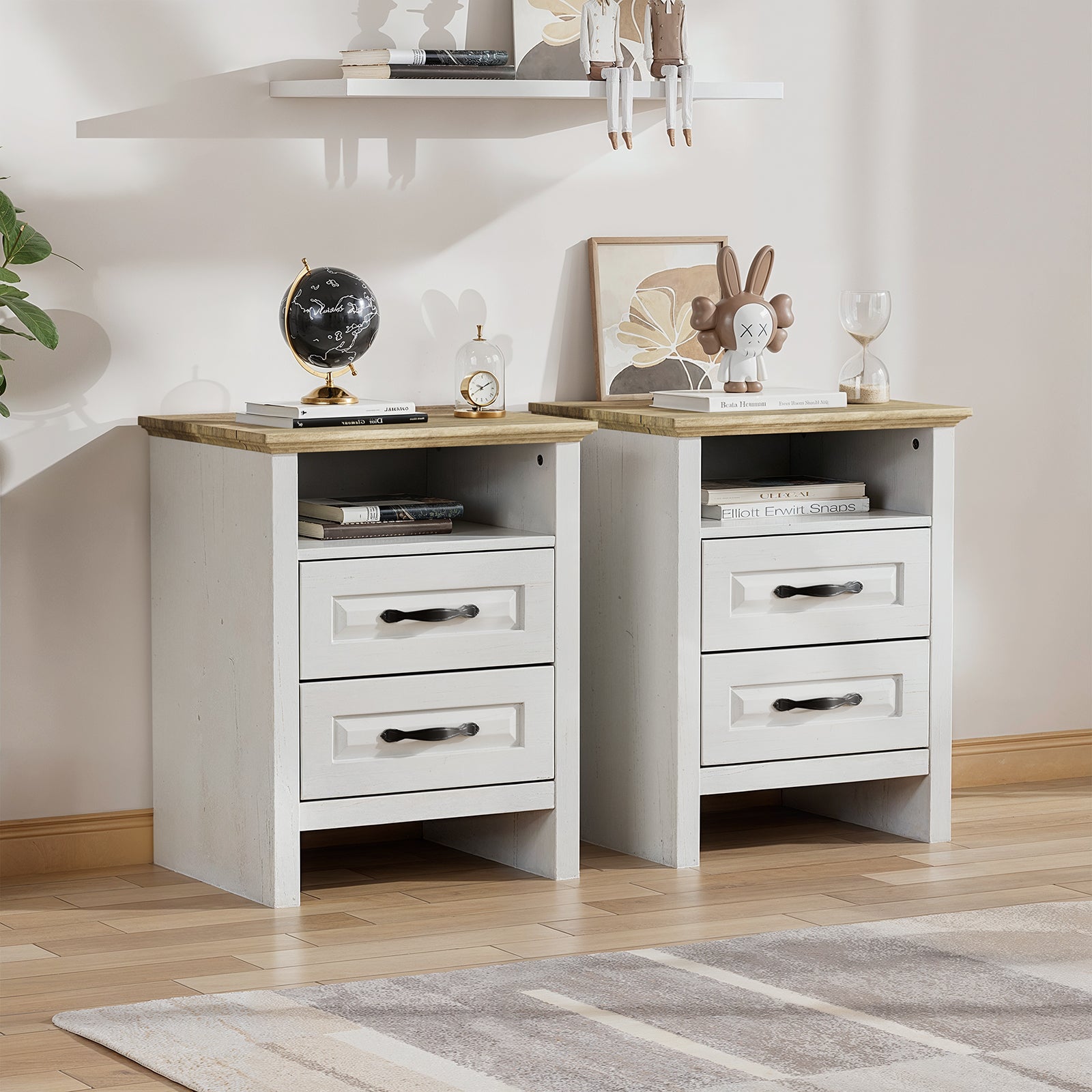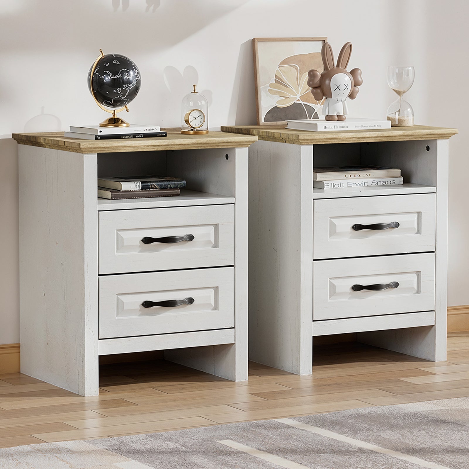 CHITOOMA Nightstand Set of 2 with Charging Station, 2-Drawer Wood Bedside Table with Open Shelf, Small End Table for Bedroom Living Room, White & Brown