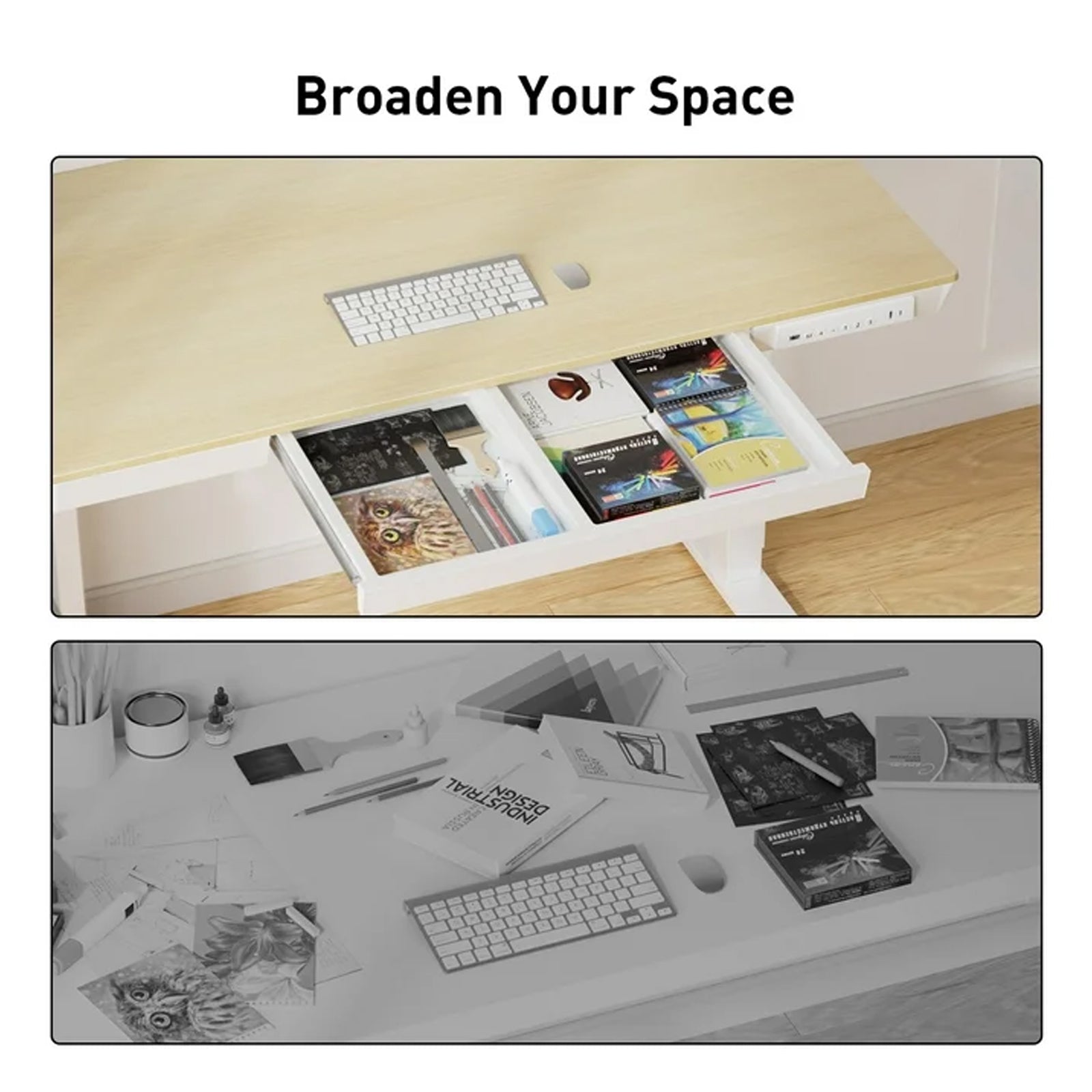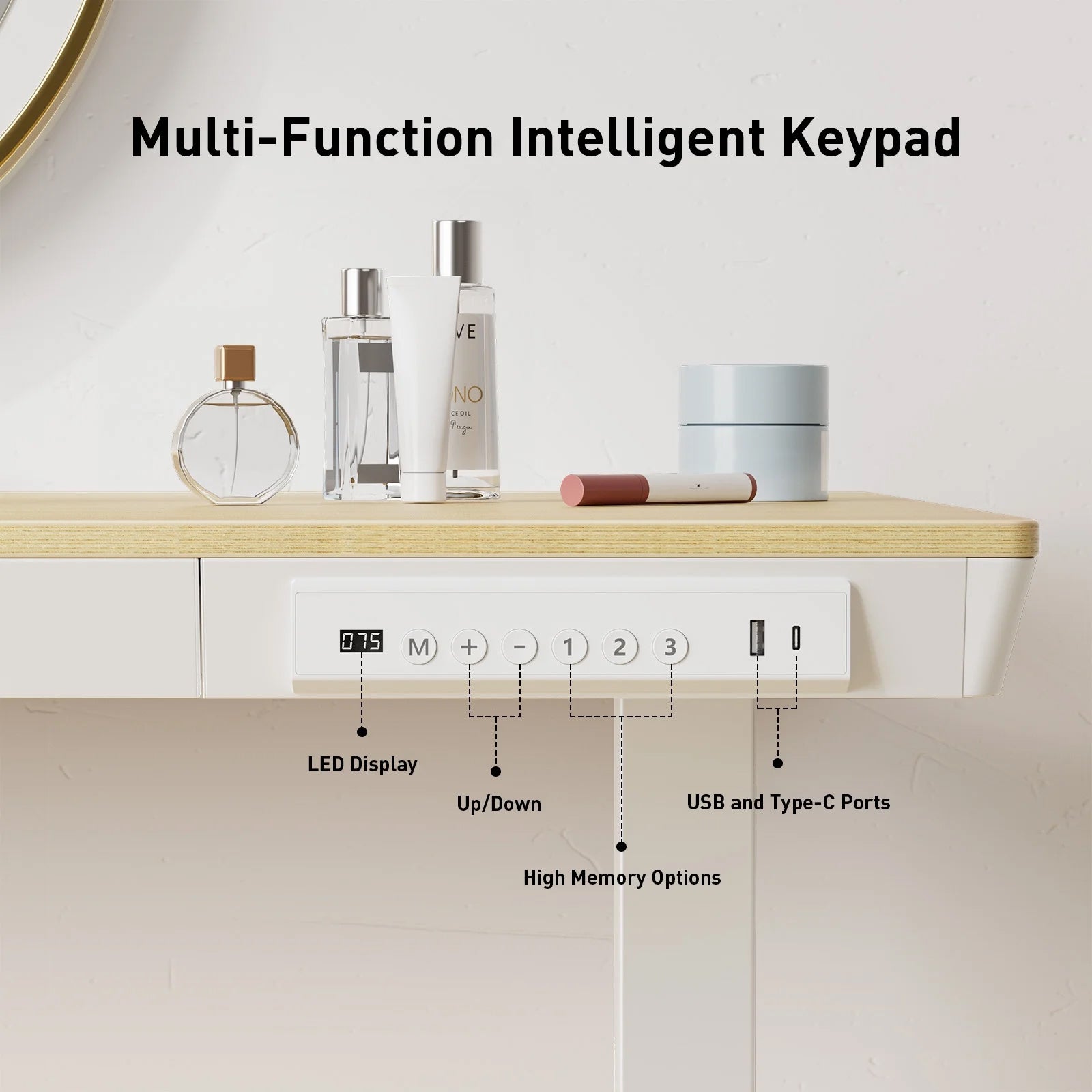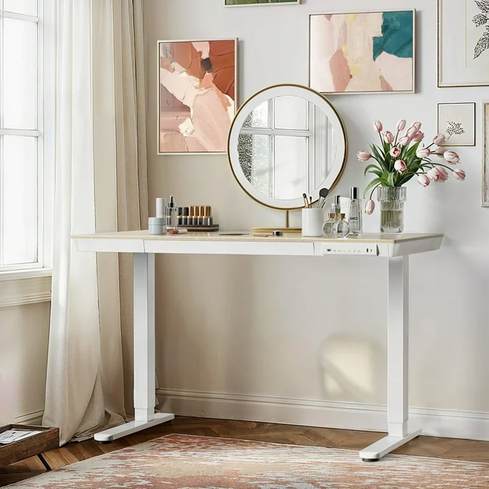 The Height-Adjustable Standing Desk is a multifunctional and stylish solution for modern living. With an extended height adjustment range, versatile charging ports, a spacious organized drawer, and anti-collision safety, it adapts to various needs. Whether used as a workstation in your office or a vanity table in your bedroom, this desk combines elegance with practicality to enhance your daily life.