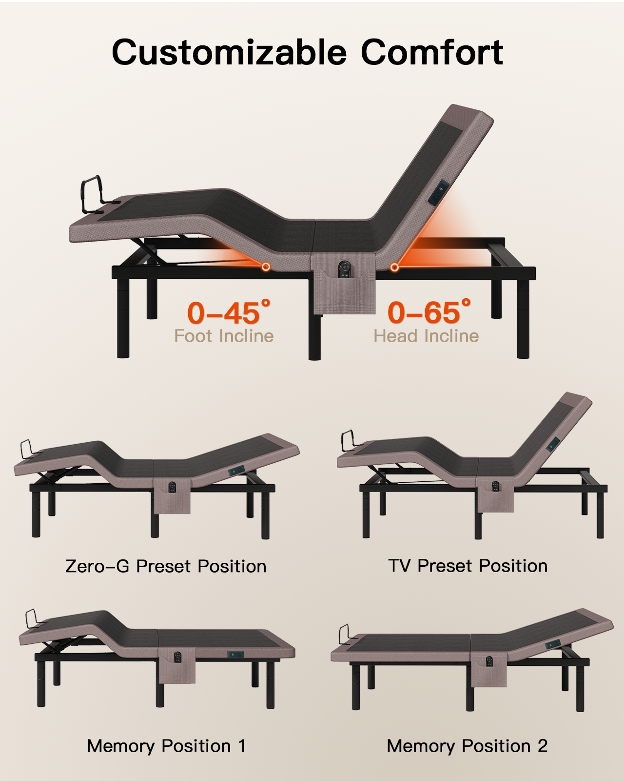 - Independently Adjustable Head & Foot Sections:Easily raise or lower the head (0–45°) and foot (0–65°) areas independently or simultaneously to find your ideal position for reading, relaxing, or sleeping. Includes a one-touch Zero Gravity mode that improves circulation and reduces pressure on your back and legs.