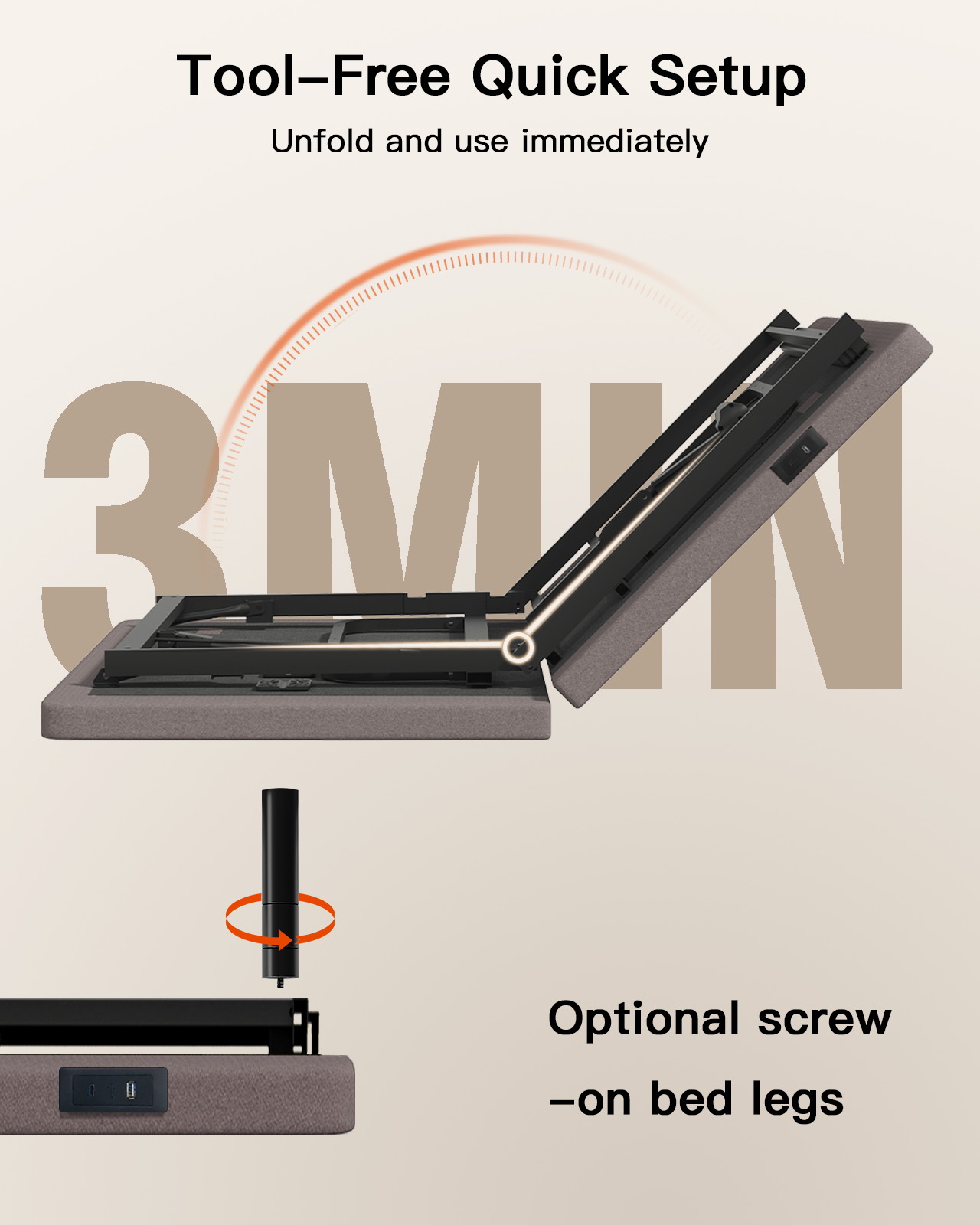 - Easy 3-Step Assembly — Tool-free Installation:This electric bed frame is made for streamlined setup with no extra tools needed. Simply secure the bed legs, connect the electronics, and insert the mattress retainer bar. Spend less time on assembly and more time enjoying your new adjustable bed foundation. Compatible with memory foam, hybrid, latex, and gel foam mattresses.