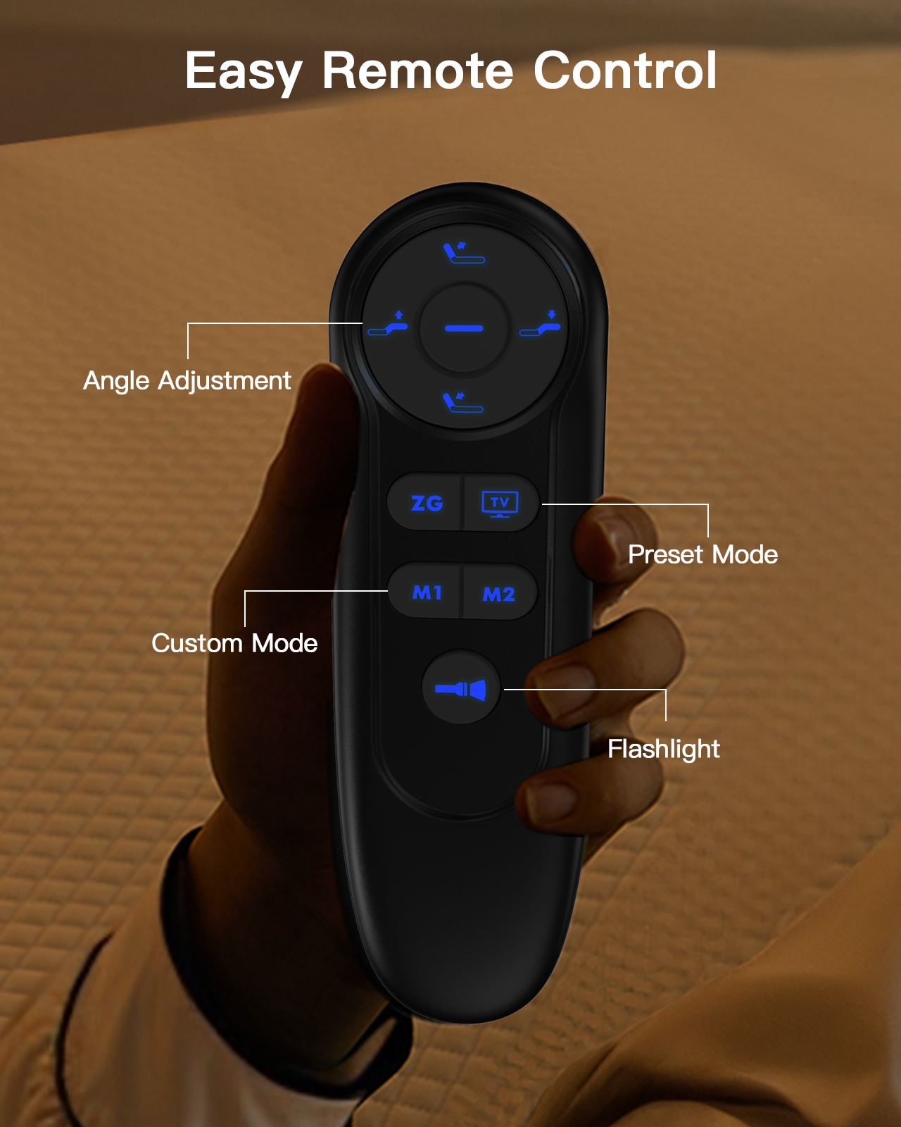 - 17-Button Multifunctional Wireless Remote Control:The smart remote lets you control every feature effortlessly—adjust head/foot elevation, switch massage settings, activate Zero Gravity, set timers, or store favorite positions (M1/M2). Includes additional features such as a built-in flashlight, under-bed LED light control, and child lock for added safety.