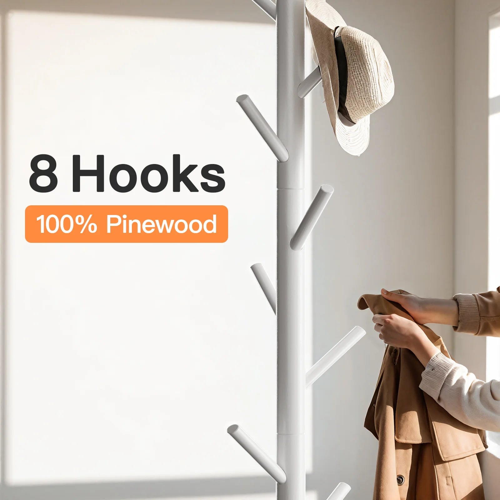 Coat Rack Stand with 3 Height Options and 8 Hooks Wooden Freestanding Coat Rack for Home, Office, Entryway, Hallway