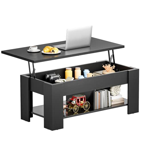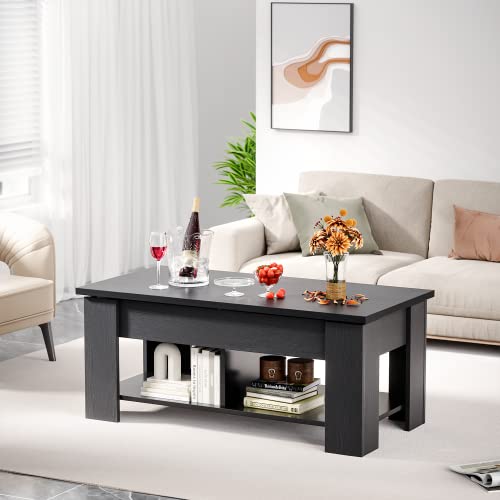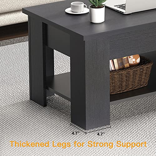 Coffee Table Lift Top with Storage Compartment and Separated Open Shelves, Pop Up Coffee Table for Living Room, 39.4in L, Black